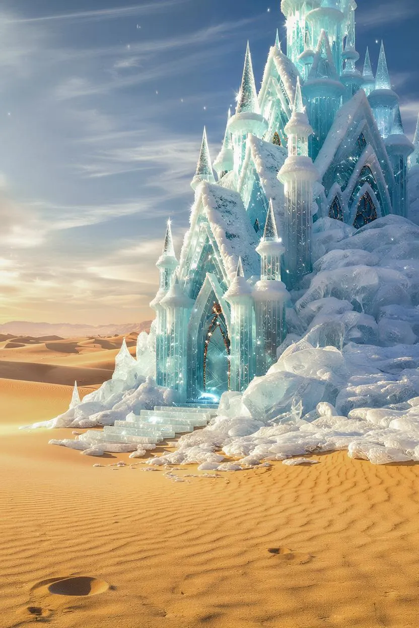 A hyper-realistic scene of Elsa's iconic ice castle, stunningly juxtaposed against a vast desert landscape. The icy structure, made of sparkling, translucent ice, glows against the golden, sun-scorched sand dunes. Every crystal is intricately detailed, catching the light in surreal ways. The contrast between the cool, frosty architecture and the warm, arid environment creates an artistic tension. The light plays across the ice’s sharp edges, casting long, dramatic shadows on the desert floor. The scene is breathtaking, evoking a sense of wonder and surreal beauty, with immaculate attention to detail and vivid realism.