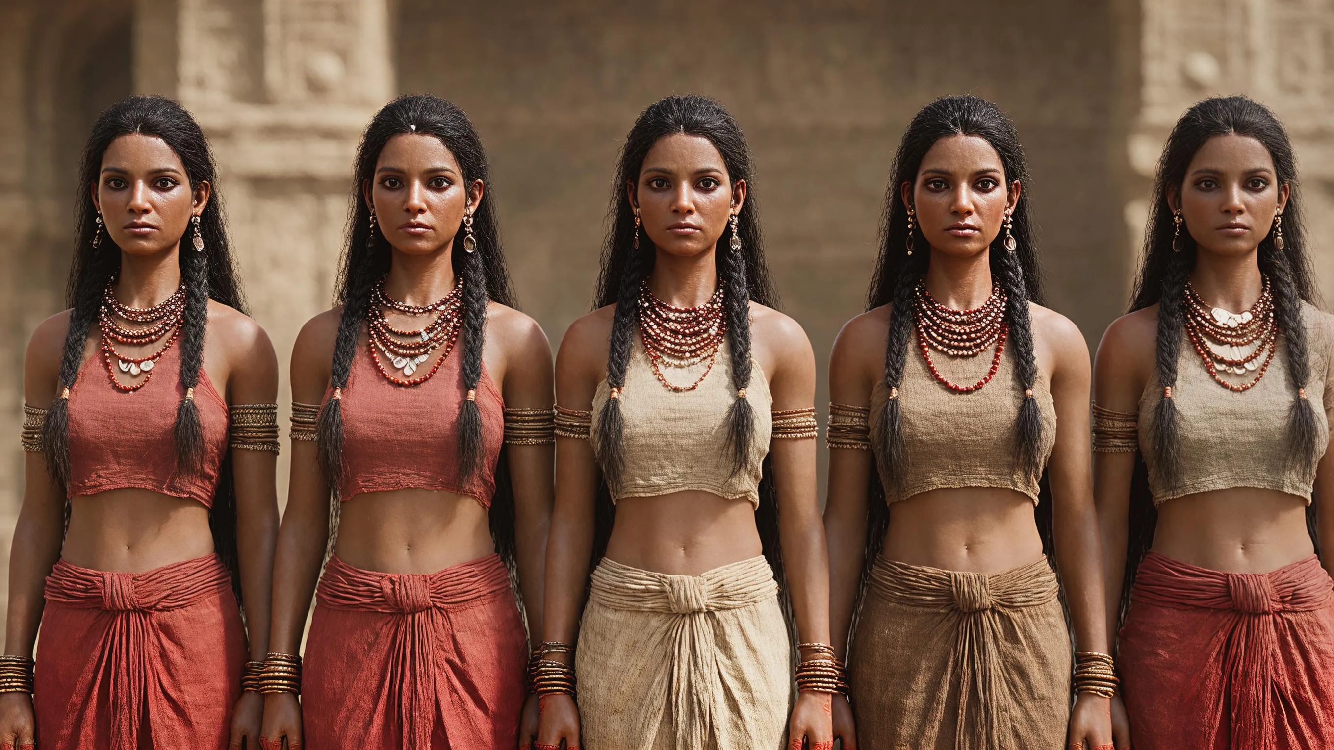 Indus Valley Harappa Culture – Ultra Photorealistic IMAGE (Complete w/ Detailed Background People) Ultra-photorealistic 8K still image of five identical Indus Valley women from Harappa/Mohenjo-Daro (2600–2000 BCE peak period), standing in perfect straight line formation facing viewer, authentic proto-Dravidian features (smooth medium-brown skin, dark almond-shaped eyes, straight black hair in long braids with shell ornaments, sturdy healthy builds). Stable, archaeologically accurate cotton clothing & confirmed accessories: Simple draped cotton lower garments (dhoti-style shorts to knees) in natural earth tones (ochre red, beige-brown, mud-red) Short upper body wraps/tunics showing shoulders/arms Terracotta bangles (Harappa finds), carnelian bead necklaces (6-8 etched beads), shell disc earrings, ivory combs Subtle kohl lining, minimal henna on hands Precise group positioning (left to right): Tallest: ochre red dhoti + beige wrap, largest carnelian necklace Medium: brown dhoti + red wrap, terracotta bangles both arms Center: beige dhoti + ochre wrap, double carnelian + shell strand Medium: red dhoti + brown wrap, single large shell earrings Shortest: mud-red dhoti + beige wrap, ivory comb in braid FOREGROUND – Authentic archaeological objects: 10+ unicorn seals (clay tablets w/ Indus script), cubical stone weights (1:2:4 system) Wheel-turned pottery (storage jars, cooking pots, toy bulls), etched carnelian bead piles Lapis lazuli chunks, small ivory tusks, copper razors/fishhooks DETAILED LIVELY BACKGROUND (50+ authentic Indus people): 15 MEN: medium-brown skin, short hair/turbans, dhoti loincloths, carrying 20kg grain sacks, pushing wooden carts w/ pottery, grinding copper tools, weighing carnelian beads on stone scales 25 WOMEN: long braided hair, knee-length cotton skirts + wraps, grinding grain on saddle querns, spinning cotton at looms, filling water jars from brick wells w/ pulley ropes, carving conch shell bangles 12 CHILDREN (4-10yrs): minimal cloths, playing w/ terracotta bulls/birds, mini wooden carts, clay whistles Potters spinning wheels (red pottery), perlenmacher drilling carnelian, farmers w/ wheat/cotton bundles, fishermen mending nets PHOTOREALISTIC SETTING – Mohenjo-Daro Great Bath (thriving): Golden hour through 1:2:4 brick arches, Great Bath (12×7m pool) w/ 10 bathers using copper dippers Active street drains flowing, courtyard houses (flat roofs), lush monsoon valley (wheat/cotton fields, flowing Indus) Egalitarian metropolis vibe – no kings/palaces, geometric streets bustling Ultra-photorealistic details: Skin pores/sweat sheen/dust on feet for ALL 55+ figures, cotton weave texture, brick mortar gaps Depth of field: razor-sharp dancers/objects, detailed populated background Warm golden monsoon lighting, physically correct shadows