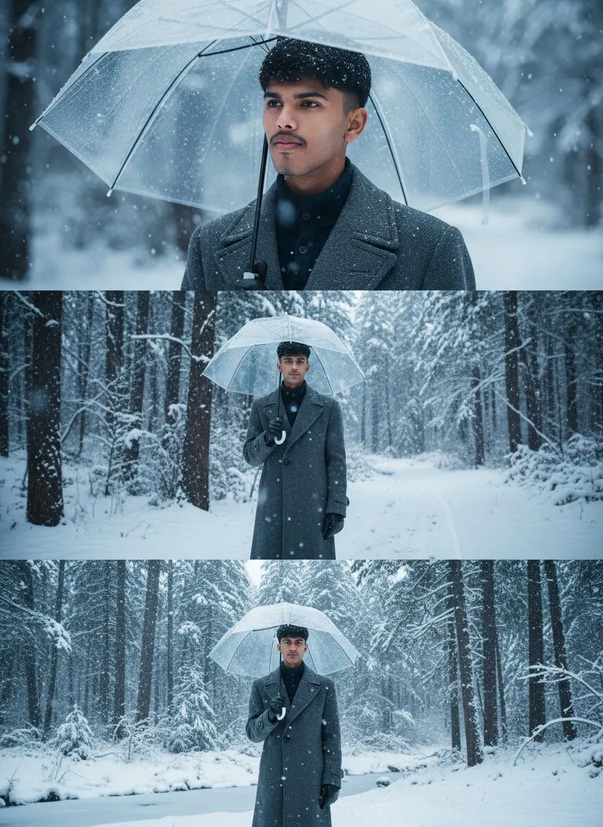 把参考图做成三帧电影分镜,把参考图做成三帧电影拼接分镜,上中下3屏分镜摄影(特写、近景、中景或者远景)。每一帧都有上传的人物,穿着复古的高级定制感灰色大衣,持透明雨伞立于冬季雪景中,白雪覆盖的树林里雪花飘落,冷色调,画面质感细腻,五观进行磨皮美颜,实拍,氛围沉静优雅,高级摄影感电影感,艺术感。