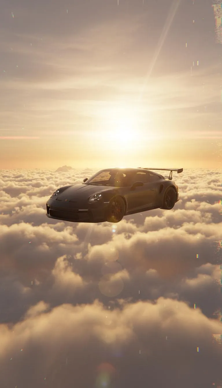 Create hyper-realistic cinematic AI art: a car floats above golden-hour clouds. Experience thick volumetric clouds, dramatic sunlight lens flares, and a glitch transition. Unreal Engine 5 quality, 8K resolution epic surreal atmosphere generated by vivago.ai's powerful AI image tools. Transform prompts into stunning visuals.