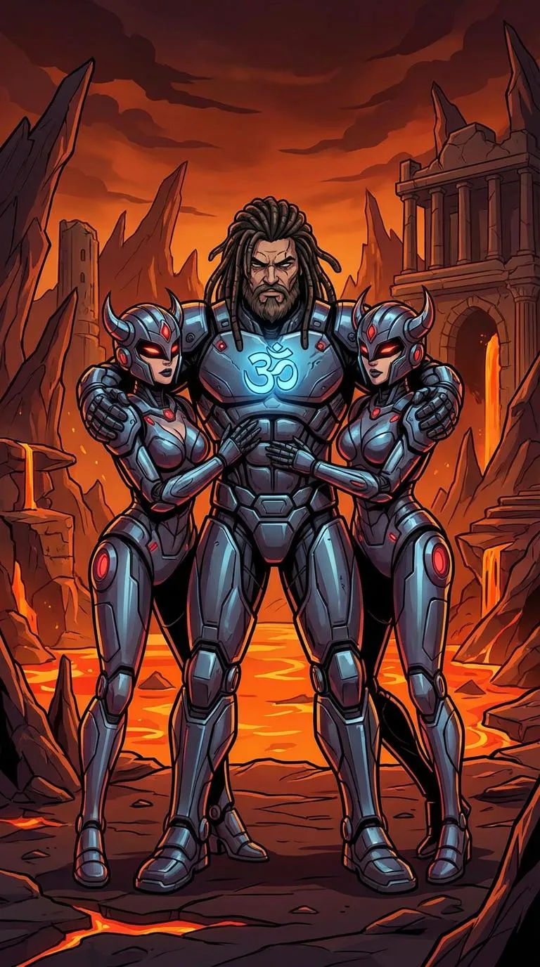 Attractive evil Hindu muscled Aghori in fully robotic suit with om logo in his chest along with two demoness wives in both fully wearing robotic suit hugging together in hell in HiDream-1 Fast cartoon style