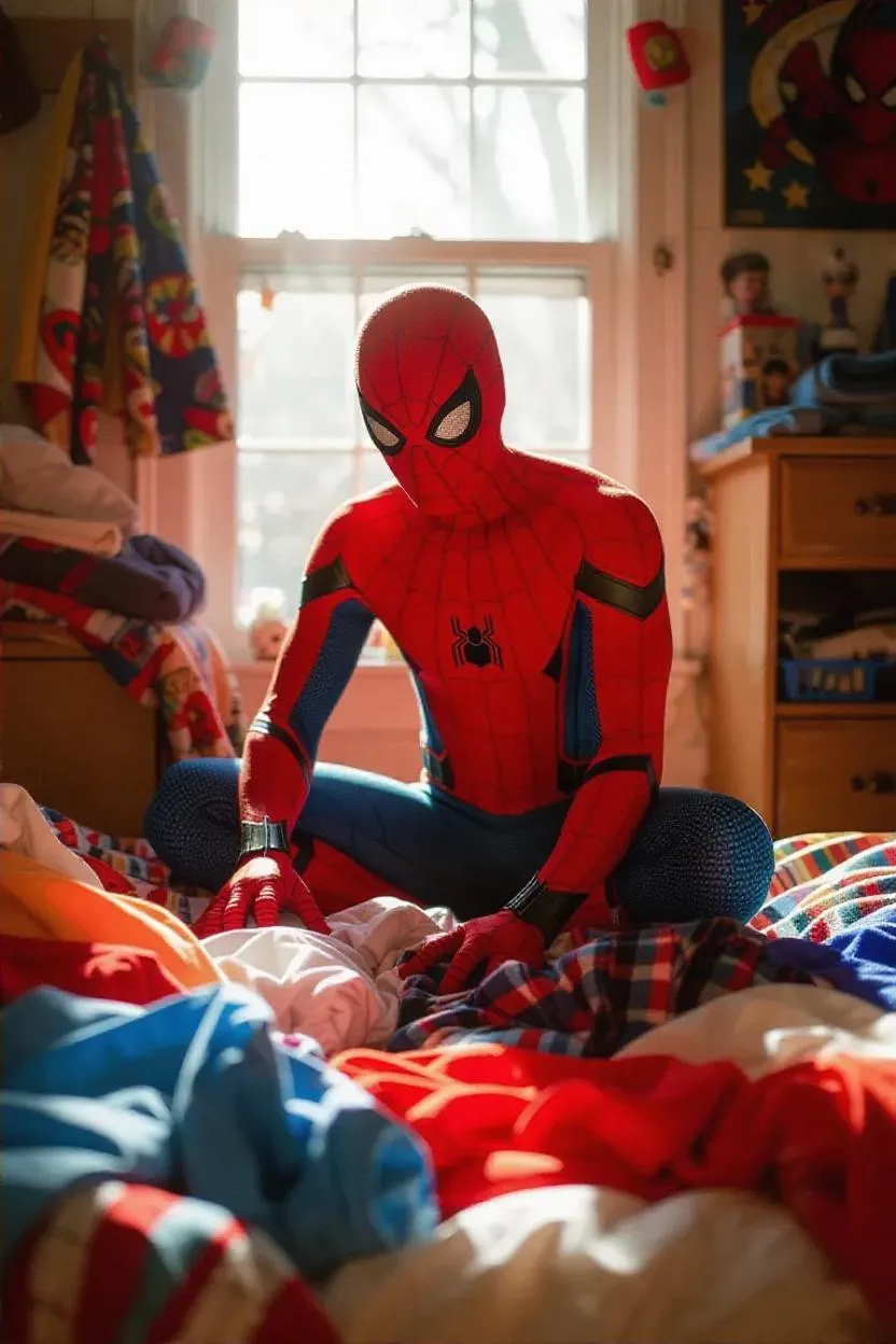 Spiderman, in his iconic suit, diligently sorting and folding laundry in a modern, sunlit apartment. The room is cluttered with superhero gadgets and Spiderman-themed decor, adding a playful and relatable vibe to the scene. The camera captures the moment with a candid, documentary-style flair, emphasizing the everyday life of a superhero.