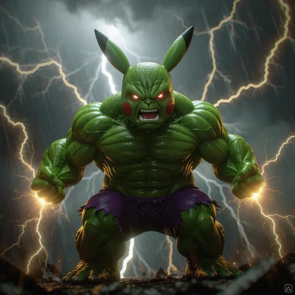 Pikachu Hulk, towering and emerald-green, eyes blazing with fury, muscles bulging, electric sparks crackling around his fists, set against a dark, stormy sky with lightning bolts.
