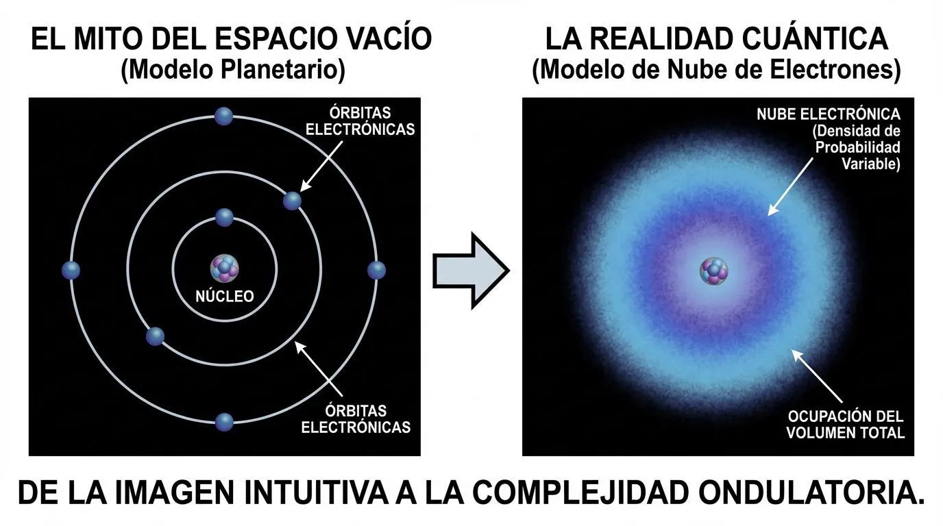 Visualize the quantum atom: shatter the empty space myth. Generate a scientific image showing electron probability clouds filling the entire atomic volume, replacing outdated solar system models. Depict wave-like electron densities, highlighting the non-intuitive reality of quantum mechanics. Text must be in Spanish. (Word count: 40)