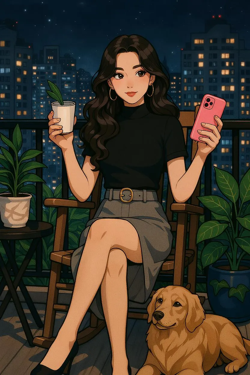 Vivago.ai creates AI-generated images of elegant urban women in tranquil settings. Design a sophisticated lady with a pet on a balcony at night using our AI image generator for detailed, stylish results. Generate a fashionable woman portrait scene instantly. (Word count: 42 words)
