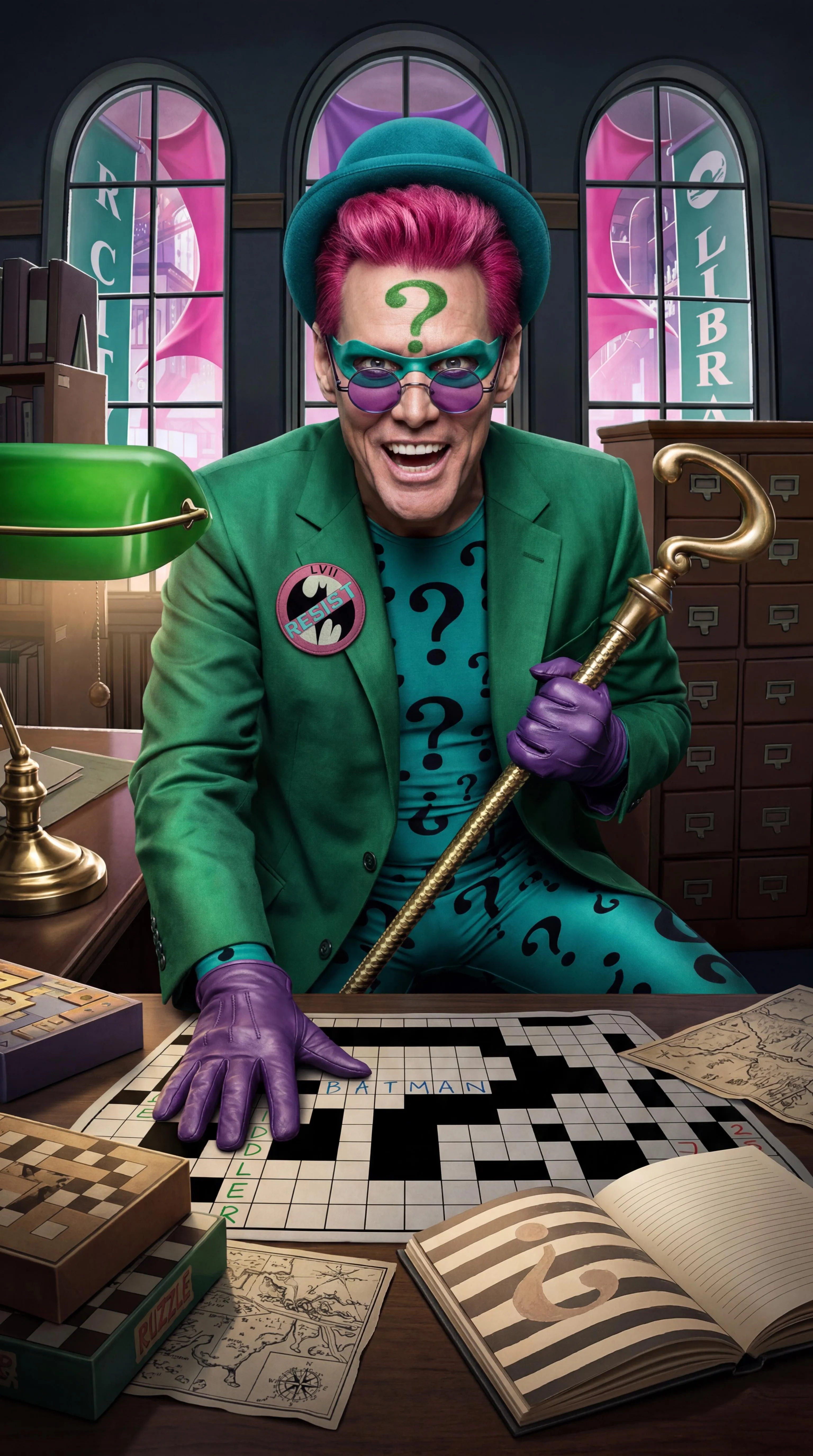 Norman Pinkus a.k.a. the Riddler (from Batman: Revolution) and Edward Nigel Maynard a.k.a. the Riddler (from Batman '89: Echoes) interchangeably combine together into each other as one with Edward Nashton a.k.a. the Riddler (portrayed by Jim Carrey in Batman Forever), facial and physical features and outfits alike, visually translating the art styles of Norman Pinkus and Edward Nigel Maynard into the realistic aesthetic of Carrey's Riddler, giving the Riddler a live-action feel. No sensitive information or guidelines violating content seen or involved.