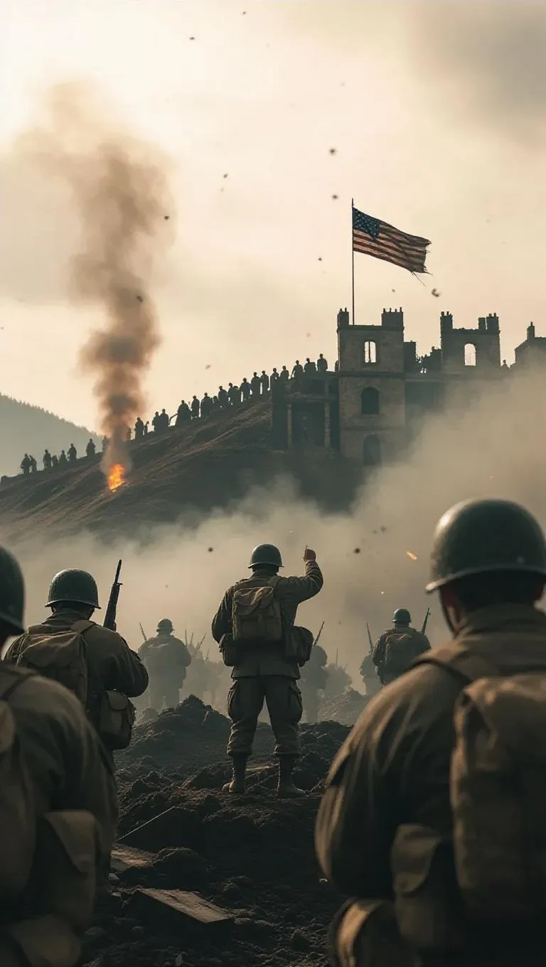 Generate intense battlefield visuals with AI: gritty combat scenes, soldiers in tattered uniforms, smoke-filled skies, bombed-out buildings, and ground craters. Capture raw war chaos and emotion using prompts. Design a poignant moment of hope with a lone soldier raising a flag atop a hill.