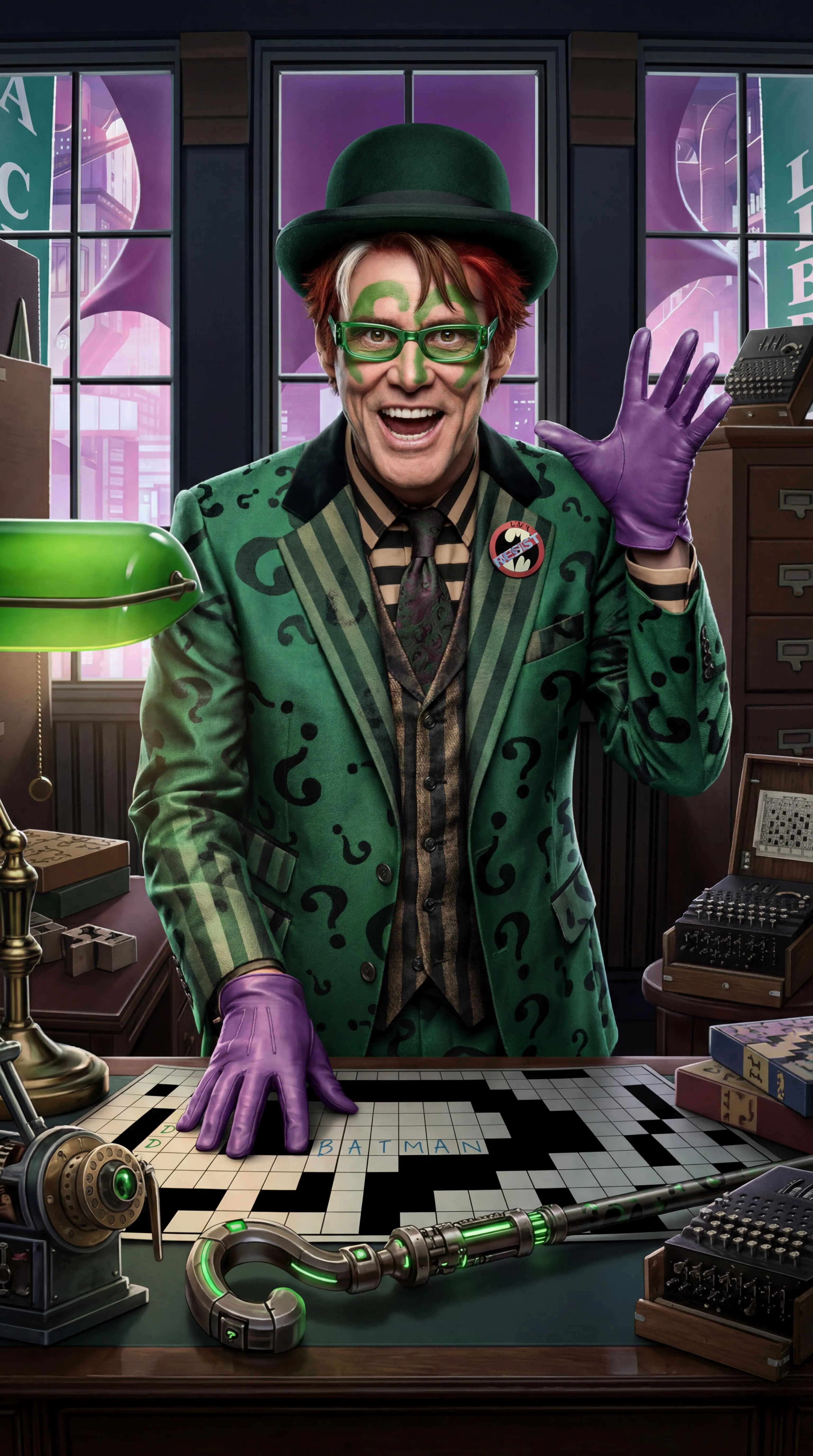Norman Pinkus a.k.a. the Riddler (from Batman: Revolution) and Edward Nigel Maynard a.k.a. the Riddler (from Batman '89: Echoes) interchangeably combine together into each other as one with Edward Nashton a.k.a. the Riddler (portrayed by Jim Carrey in Batman Forever), facial and physical features and outfits alike, visually translating the art styles of Norman Pinkus and Edward Nigel Maynard into the realistic aesthetic of Carrey's Riddler, giving the Riddler a live-action feel. No sensitive information or guidelines violating content seen or involved.