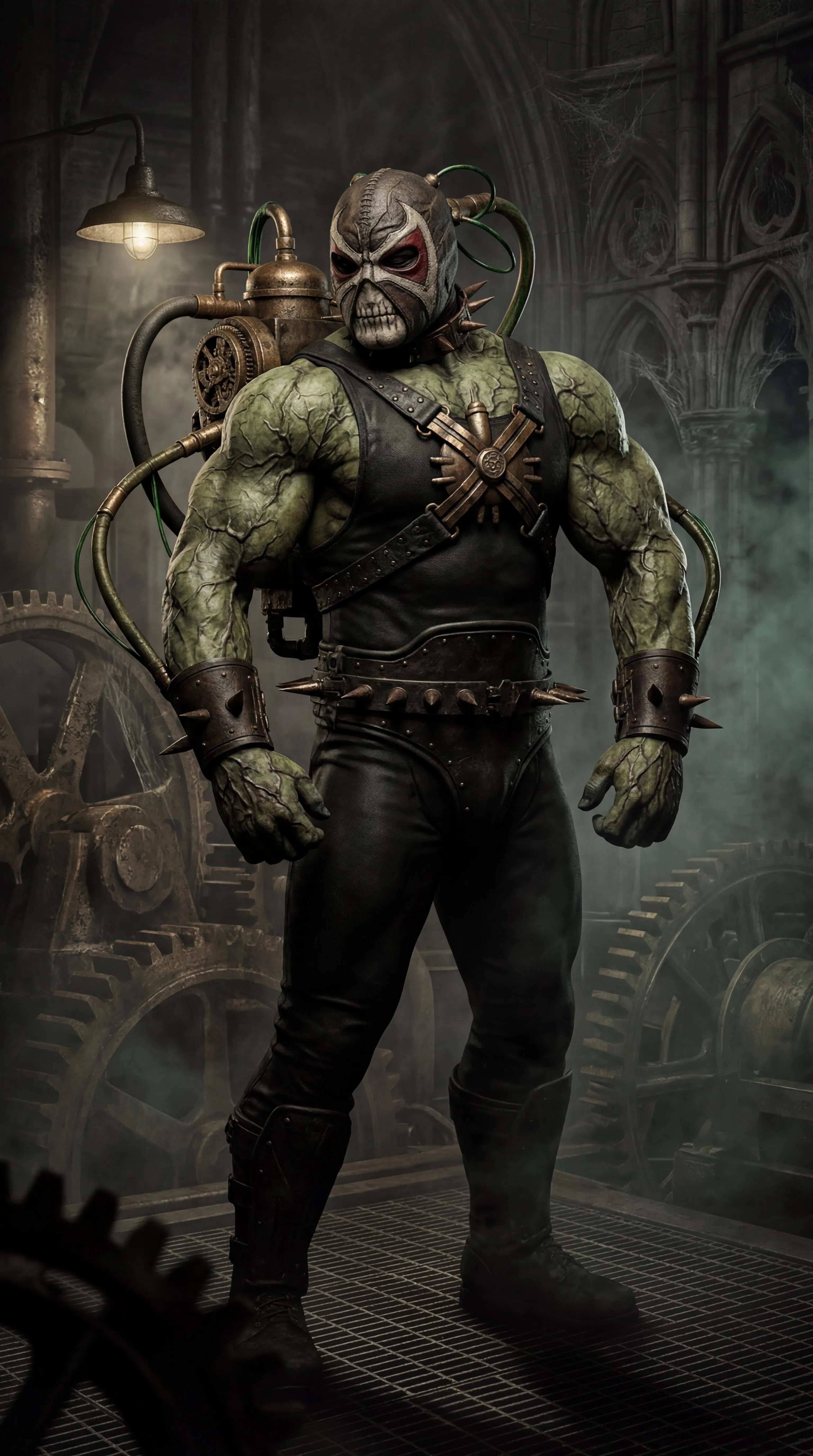 The art style from how Bane appears in the comics are translated into the realistic aesthetic of Robert Swenson's live-action portrayal of Bane (from Batman & Robin), albeit to fit Tim Burton's much darker and more gothic tone for the Batman films instead of Joel Schumacher's much flashier and more flamboyant direction. He isn't firing his gatling gun, nor is there any artist signature seen. No sensitive information or guidelines violating content seen or involved.