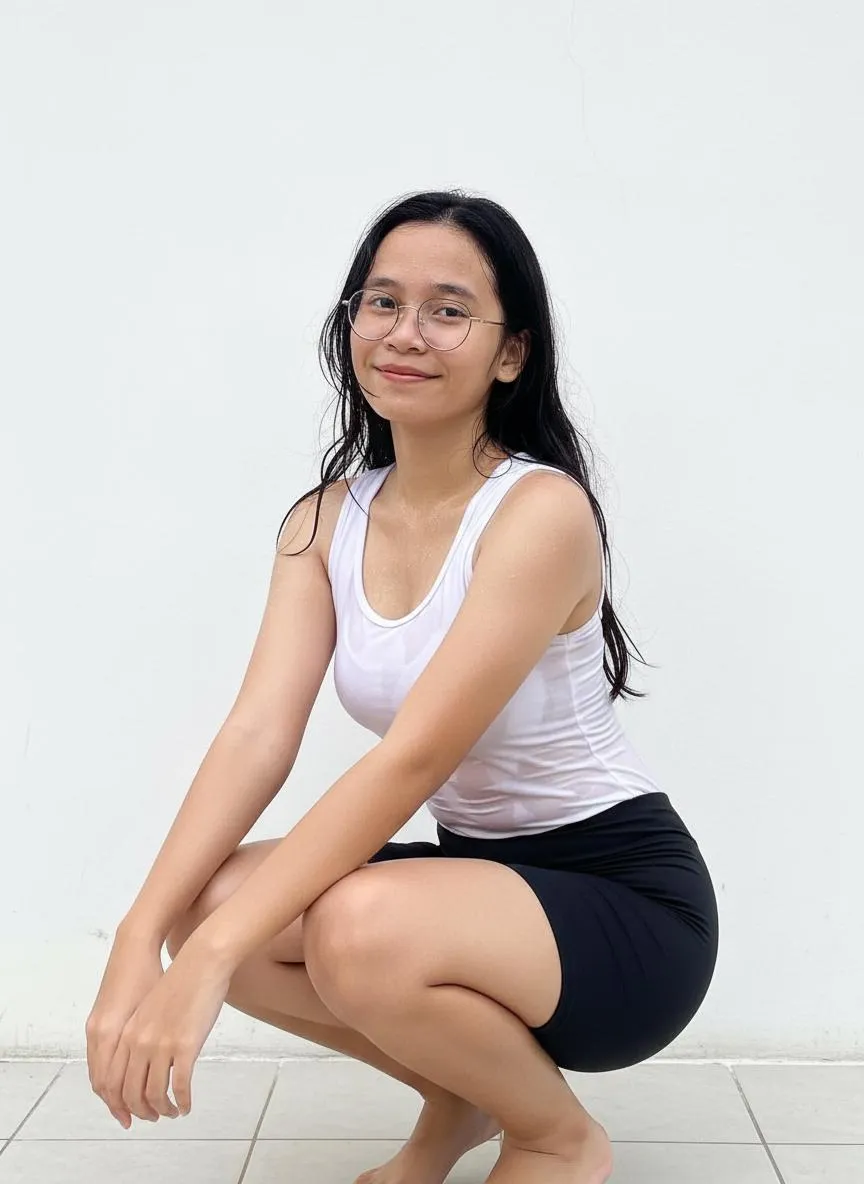 Generate realistic AI images of a sweaty fitness woman in a white singlet and black shorts. Capture her sweet smile and messy hair during an intense workout. Focus on authentic sweat details on her skin and damp singlet. Preserve her natural facial features while she crouches cutely in this vibrant close-up photo.