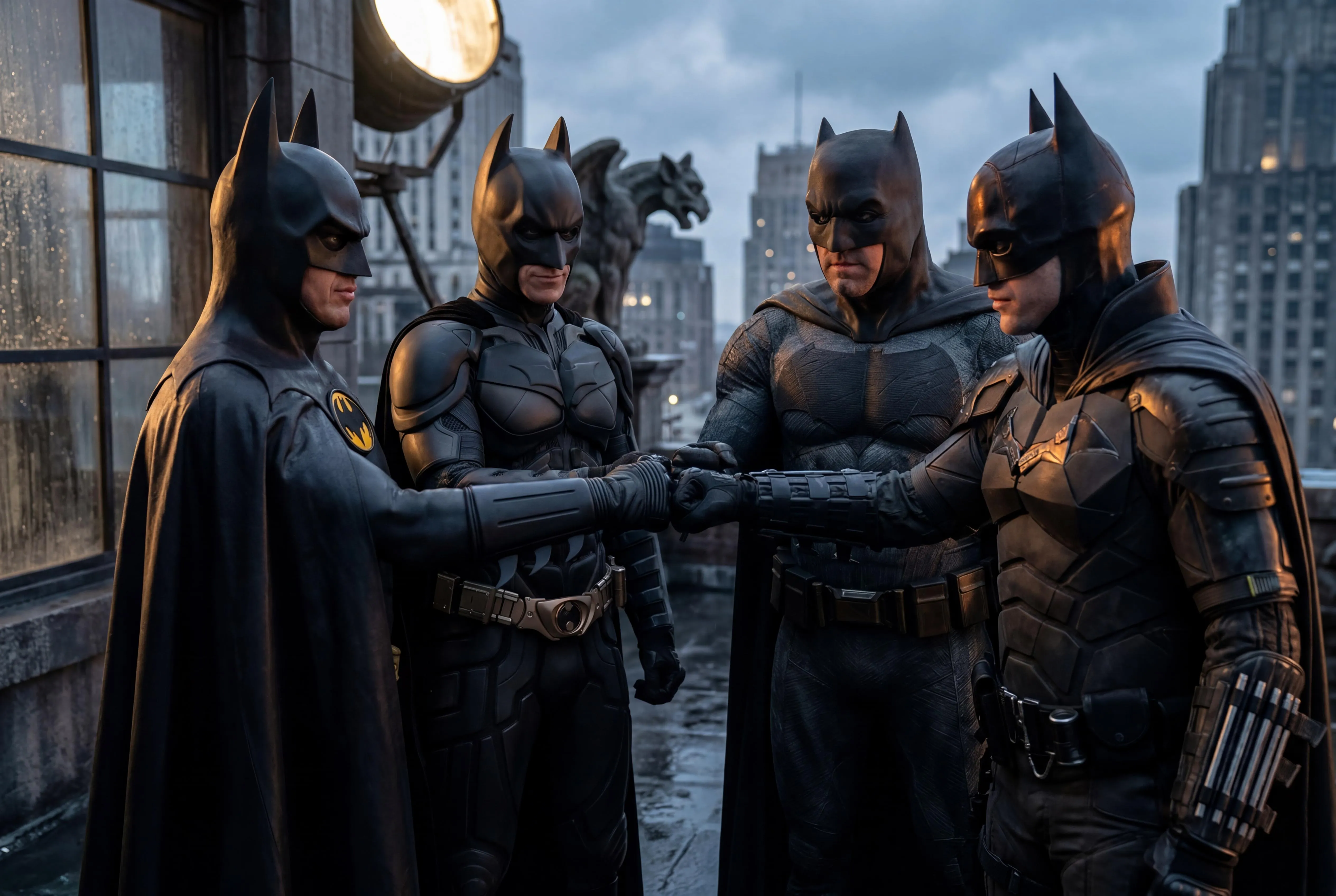 Batman (portrayed by Michael Keaton, Christian Bale, Ben Affleck, and Robert Pattinson) share a knuckle bump together.