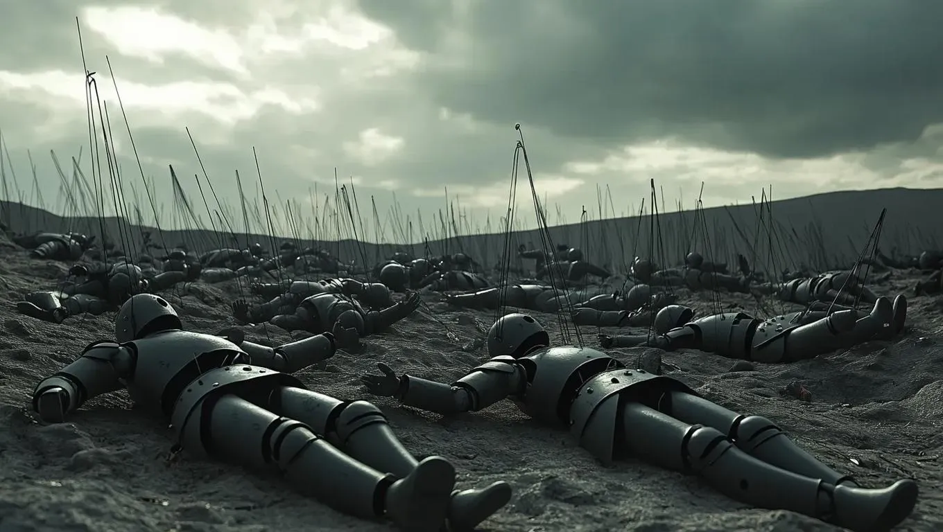 Create AI-generated art depicting a symbolic battlefield with puppet soldiers, tangled strings, and lifeless chaos under a somber overcast sky. Explore futility of war themes through dramatic visual storytelling using Vivago.ai's AI image tools for surreal, thought-provoking war narratives and symbolic imagery.