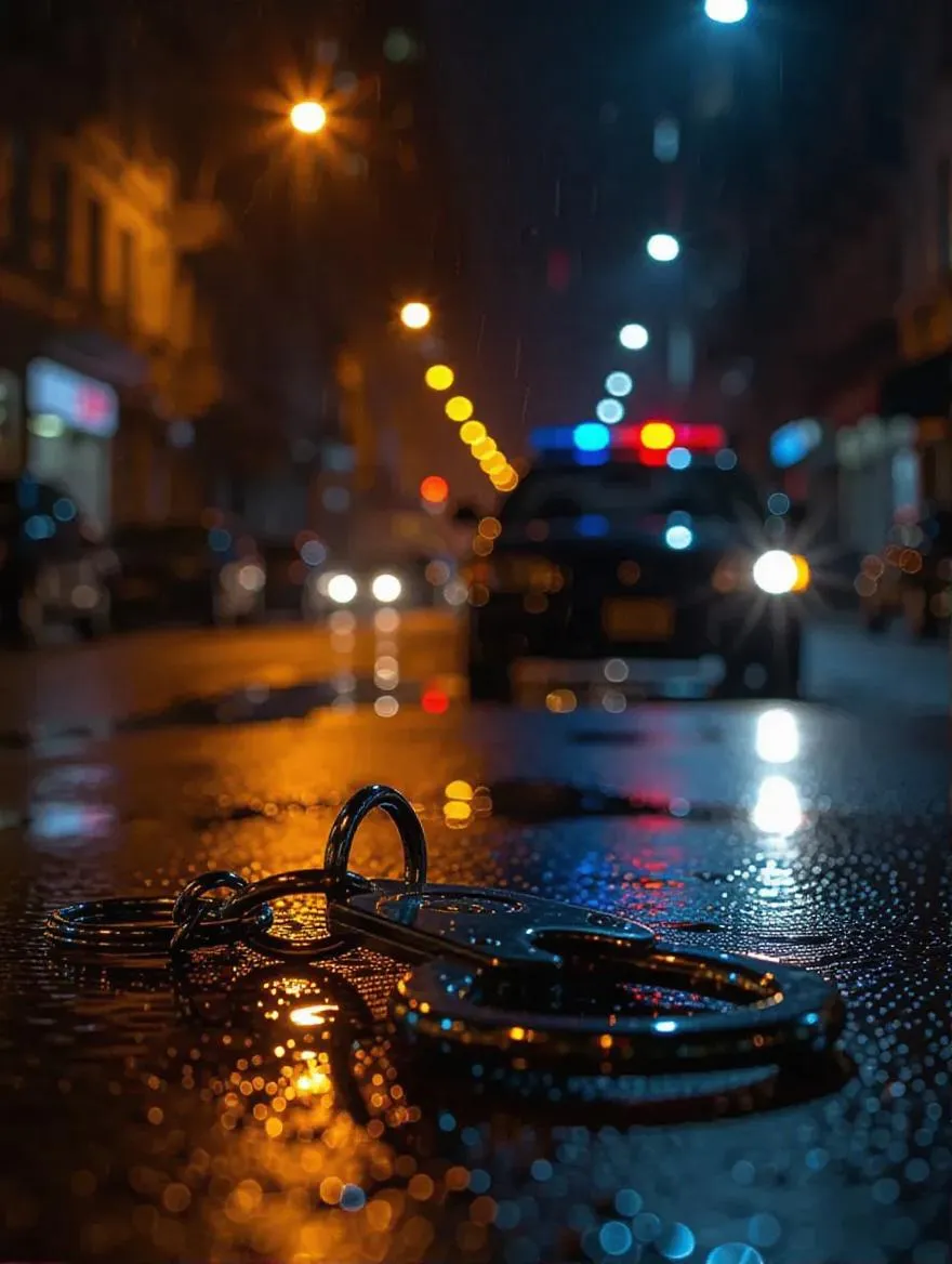 Manette d'argento di un poliziotto, riflettenti sotto una luce fredda, posate su un tavolo di metallo grigio, con un sfondo urbano notturno e una sirena che lampeggia in lontananza, creando un'atmosfera tesa e misteriosa.