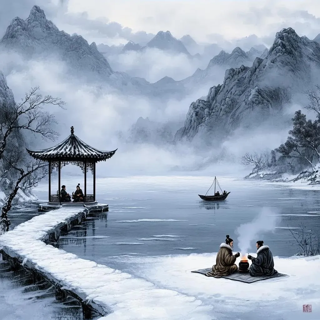 AI-generated Chinese-style winter scene inspired by Zhang Dai’s ink-wash aesthetics: snow-covered frozen lake, misty mountains, and dreamlike tranquility. Features a scholar’s boat, pavilion with wine-sipping gentlemen, and poetic stillness echoing Chongzhen-era charm. Perfect for evoking serene ancient China visuals with ethereal, silent winter beauty.