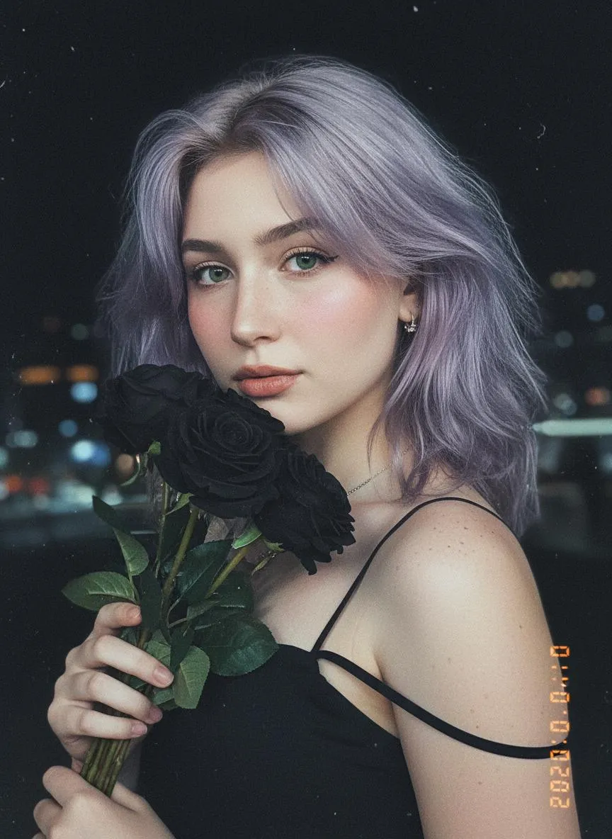 不改变上传的人物的原本的面容,超写实肖像照片,特写镜头,浅景深(背景模糊),上传的图中人物(面部特征保持不变),一头凌乱的浅紫色灰褐色齐肩长发,绿色眼睛,淡淡的粉色腮红,裸粉色嘴唇,脸颊和肩膀上有淡淡的雀斑,身着黑色无背扣的细肩带连衣裙,戴着小耳钉和细链项链,手捧一束黑色玫瑰贴近脸颊,半身转身看向镜头;拍摄角度:平视视角,夜景闪光灯强烈的对比光,冷色调调色板(黑色、浅紫色灰褐色、苍白肤色、城市夜景背景),忧郁而梦幻的氛围,高细节度,胶片质感,复古色调,胶片复古写真,颗粒感,胶片漏光效果,高清细节 ;右下角添加橙色竖排版的数字日期水印(2026:00:00)