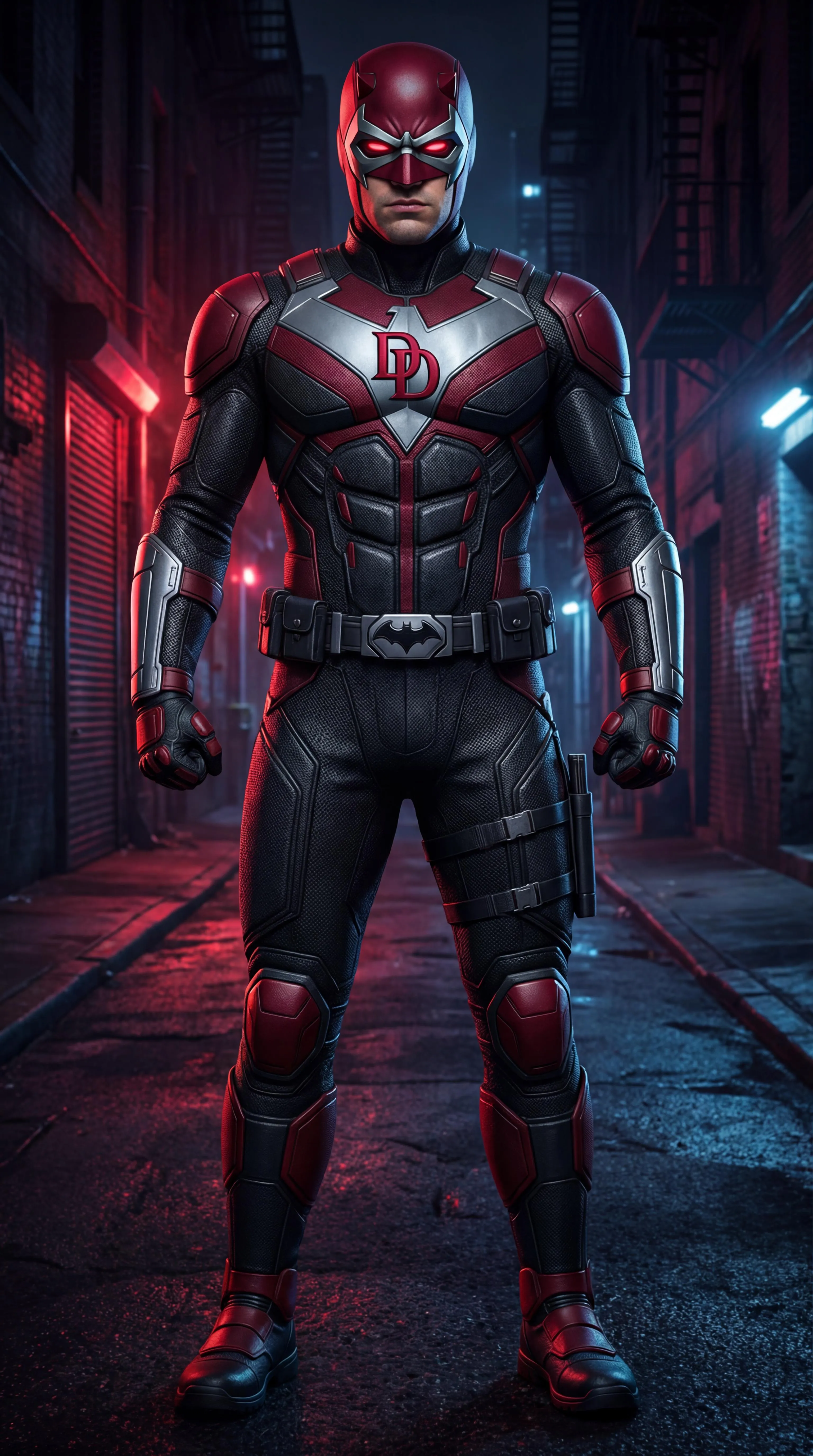 Generate Nightdevil AI art: A seamless fusion of Nightwing and Daredevil. Features a black suit with silver accents, red elements, and a unique combined mask. See the merged 'D' logos and hybrid utility belt. Create this Marvel/DC superhero crossover with vivago.ai's AI image generator. Transform prompts into stunning visuals.