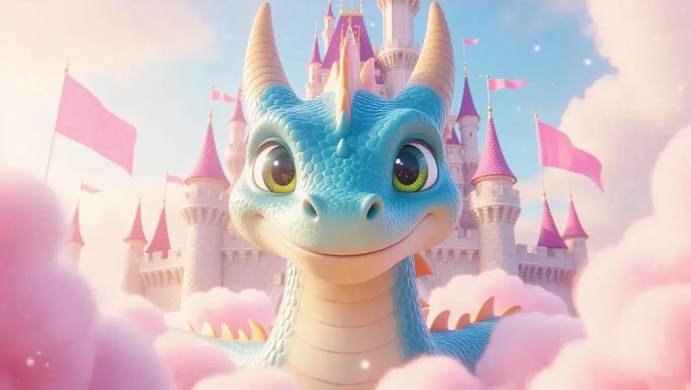 A whimsical, oversized dragon with sparkling eyes and a jovial smile, surrounded by soft cotton-candy-like puffs, creating a charming, magical vibe. The backdrop is a fluffy, enormous castle with towers resembling cotton-candy and large, friendly flags. The illustration style is inspired by children’s storybooks, featuring enchanting details and a joyful tone.