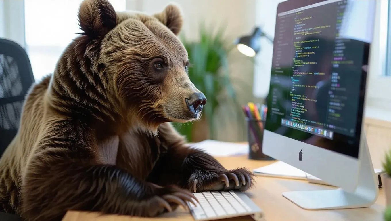 The cute fluffy brown bear sits at a modern desk, its paws clumsily tapping the keyboard as it types excitedly. The bear glances swiftly at the computer screen, where a digital process flashes, revealing lines of code and data. The camera zooms in on the bear’s astonished expression, capturing the tension and curiosity in its eyes.