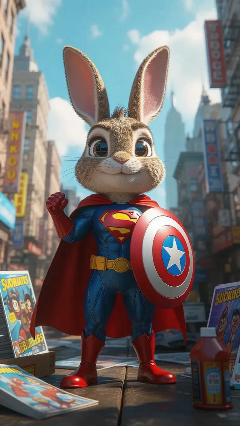 A 3D bunny in a superhero costume and cape, standing upright on two legs, holding a shield with confidence. Surrounded by comic books and gadgets, the bunny exudes bravery and justice in a cityscape setting, with a backdrop of tall buildings and a vibrant skyline.