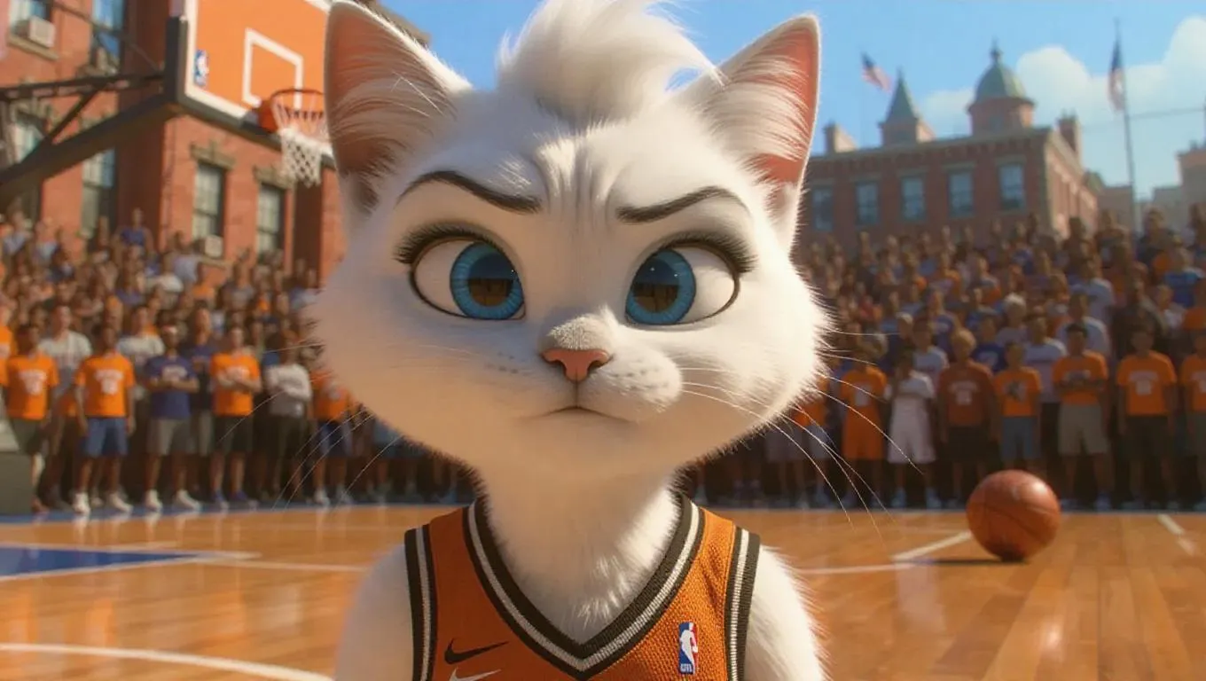 An anthropomorphic snowshoe cat with dark blue eyeballs, sporting a high hairstyle and an old-school basketball uniform, featuring ivory skin and a smug expression, captured in stunning 8K resolution, exuding bravado and charm. The scene is set on an urban basketball court, with the cat blocking a shot and the crowd gasping in surprise in the background.