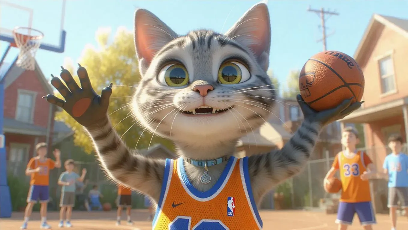 An anthropomorphic silver cat with amber-yellow eyeballs, sporting a swept-back hairstyle and custom-made basketball gear, featuring light blue skin and an inviting expression, captured in stunning 8K resolution, exuding warmth and approachability. The scene is set on a cozy neighborhood basketball court, with the cat high-fiving friends after a game and smiles all around in the background.