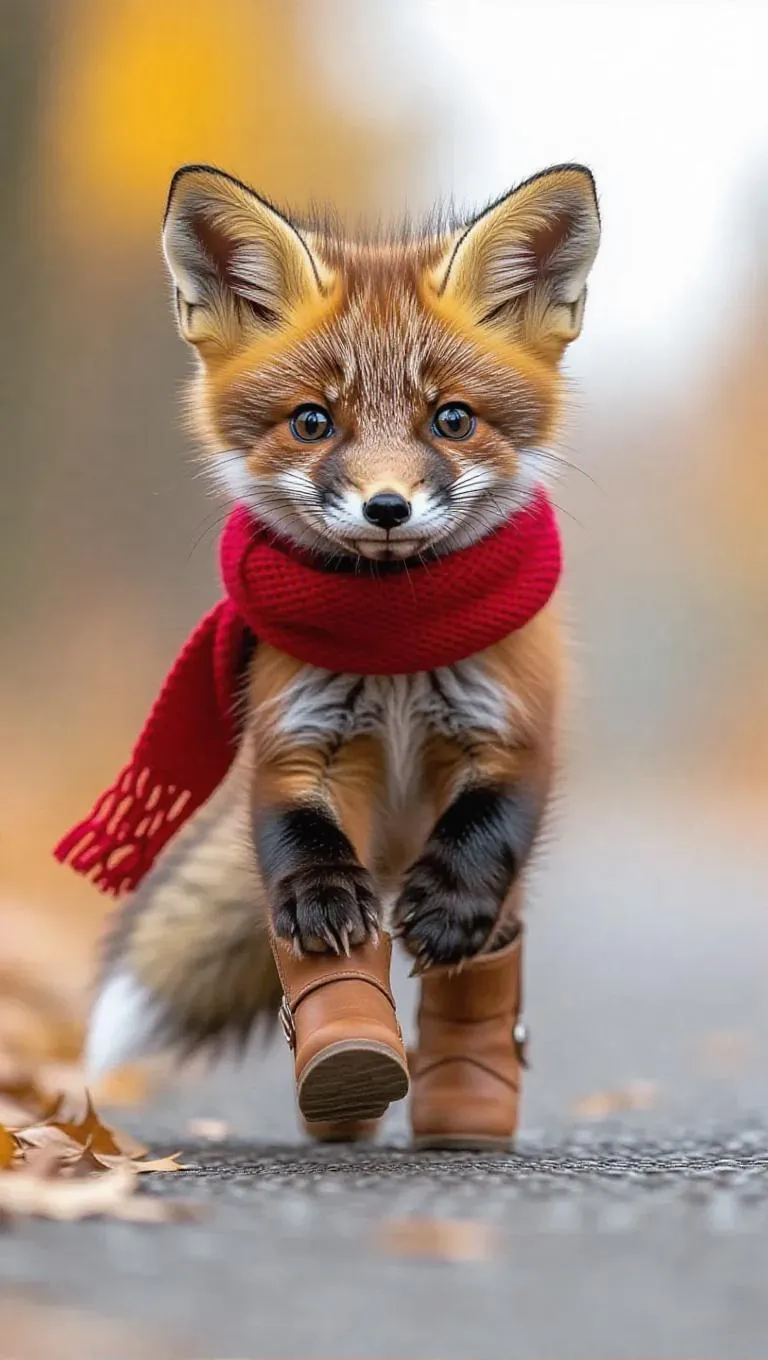 A tiny fox kit tiptoes down the runway with a mischievous grin, its bushy tail swaying cutely. It wears a red scarf and a pair of tiny boots, creating a playful and stylish outfit. The fox kit's playful energy and curious nature make it an instant favorite.