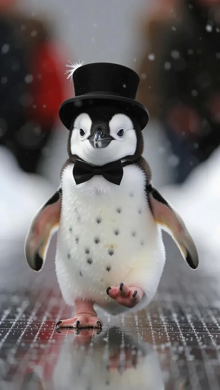 A baby penguin waddles down the runway, its black-and-white feathers sleek and shiny. It wears a tiny bow tie and a top hat, giving it a formal yet adorable look. The penguin's wobbly walk and curious peeks are utterly charming.