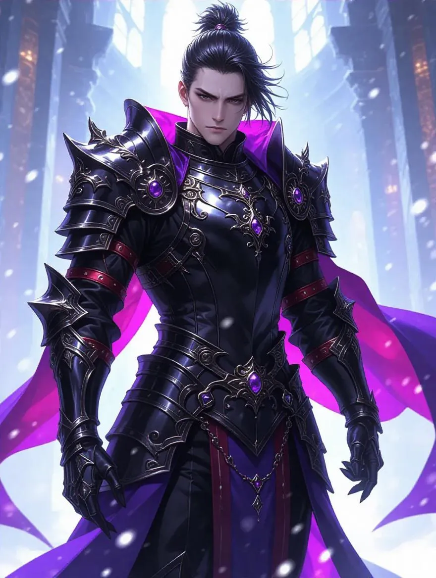 Craft striking game art of Akechi Mitsuhide in winter armor with a bold black, dark-gray, white, red, and purple palette. Elevate your AI-generated visuals using Vivago.ai's advanced tools for dynamic, professional-grade character designs inspired by historical warriors and modern gaming aesthetics.