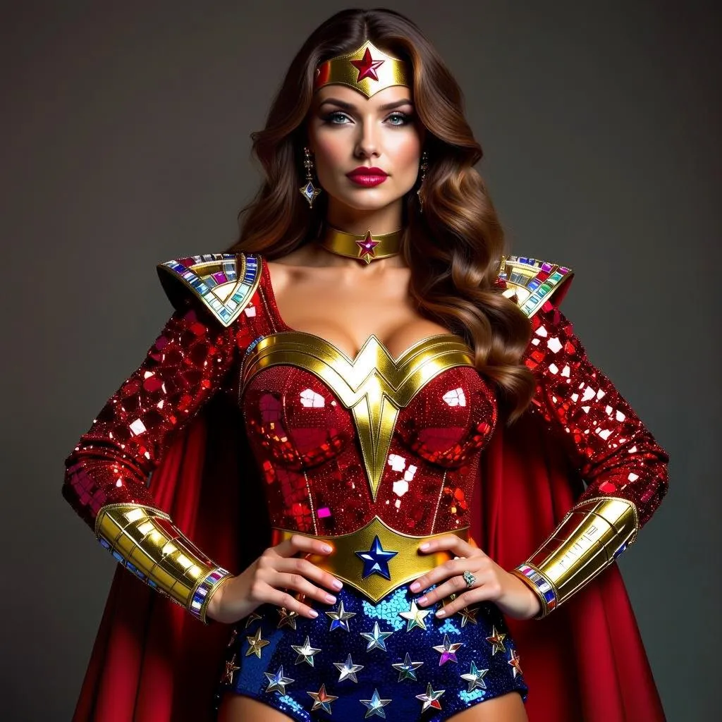 Generate vibrant AI visuals of 70s Wonder Woman in a dazzling rhinestone outfit crafted from colorful diamonds. Explore retro superhero designs with vivago.ai's AI image generator for vintage comic art, sparkling costumes, and dynamic character transformations. Perfect for nostalgic, glittering superhero imagery.