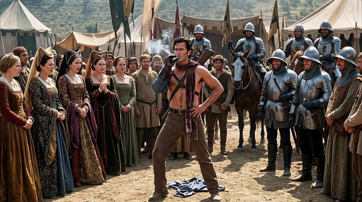 Ash dancing like diva.He drop his shirt and dancing to the guards and ladies around in medieval aga.And he smoking weed