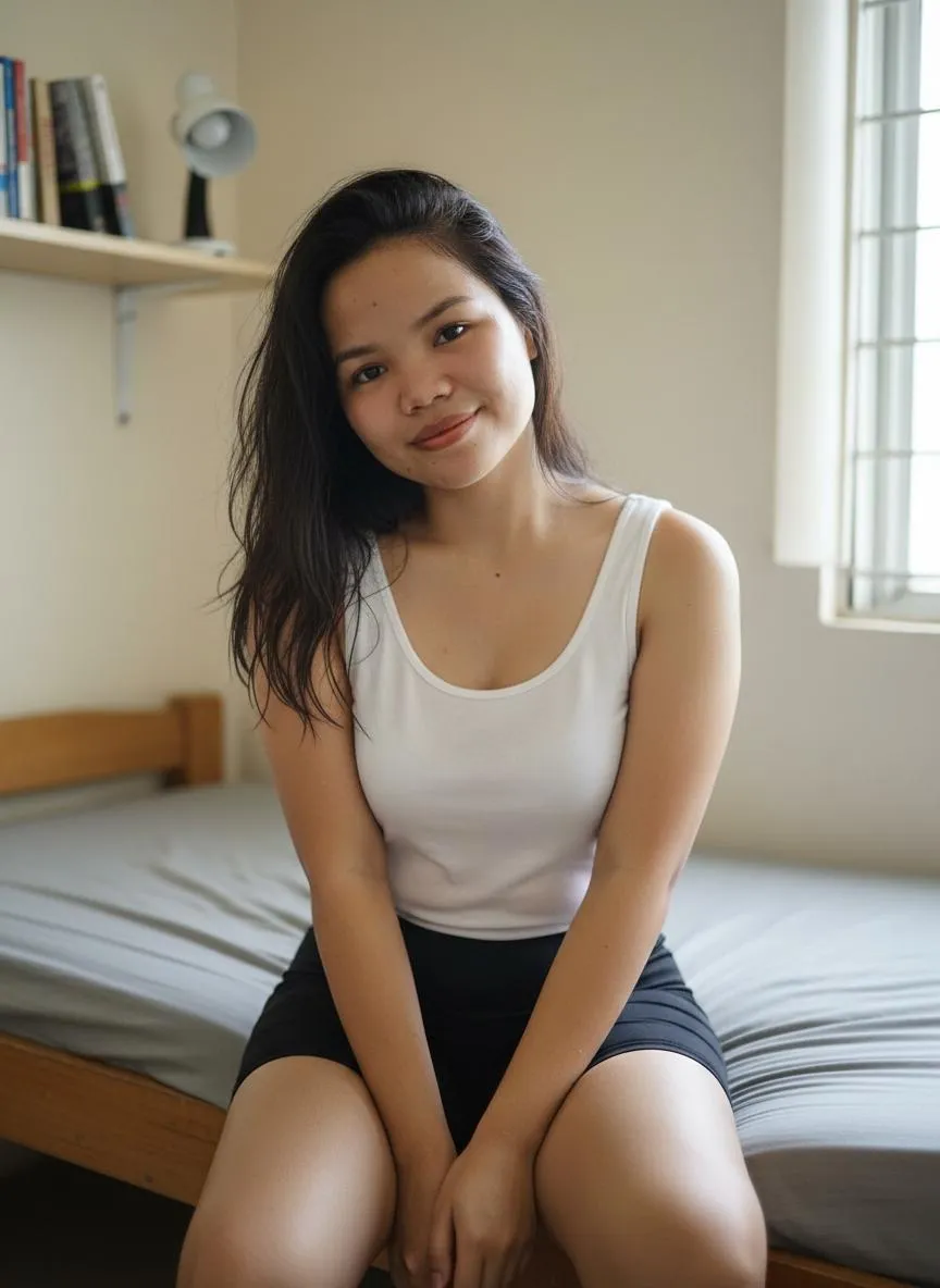 Generate hyper-realistic AI images of a tired yet smiling woman in a sweaty white singlet and black shorts. Capture her authentic exhaustion, messy hair, and soaked clothes while sitting on a simple wooden bed in a boarding room. Close-up photo focus. Create this vivid scene instantly with Vivago.ai’s AI image generator.