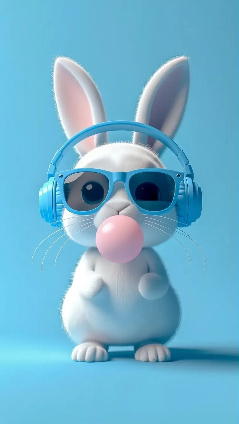 简单的 3d 可爱插图,一只戴着蓝色太阳镜和耳机的白兔,在纯蓝色的背景下吹着泡泡糖,以Loish的风格创作的数字艺术,超现实主义肖像摄影,获奖摄影作品。