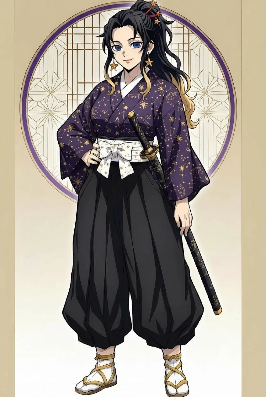 Transform your anime character with precise AI editing. Customize traditional hakama pants, black hair with golden streaks, indigo eyes, and zōri sandals. Adjust katana details with a star-shaped tsuba, securely tucked. Achieve professional-grade anime art modifications using advanced AI tools. Perfect your character design effortlessly.