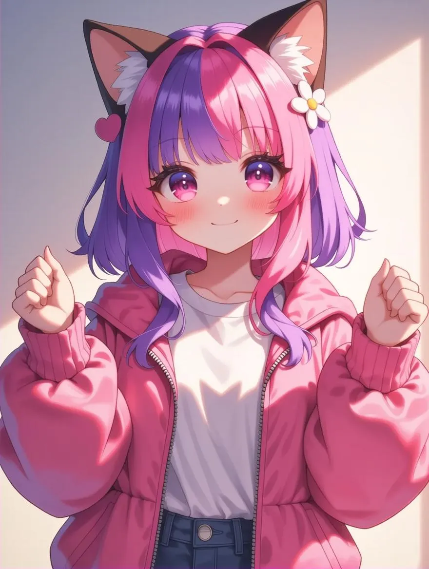 Generate vibrant AI anime characters with blush, smiles, and playful details like cat ears, multicolored hair, and heart motifs. Perfect for virtual YouTuber avatars, customize outfits, hairstyles, and accessories. Explore vivago.ai's text-to-image tools for dynamic anime art with puffy sleeves, floral accents, and expressive eyes.