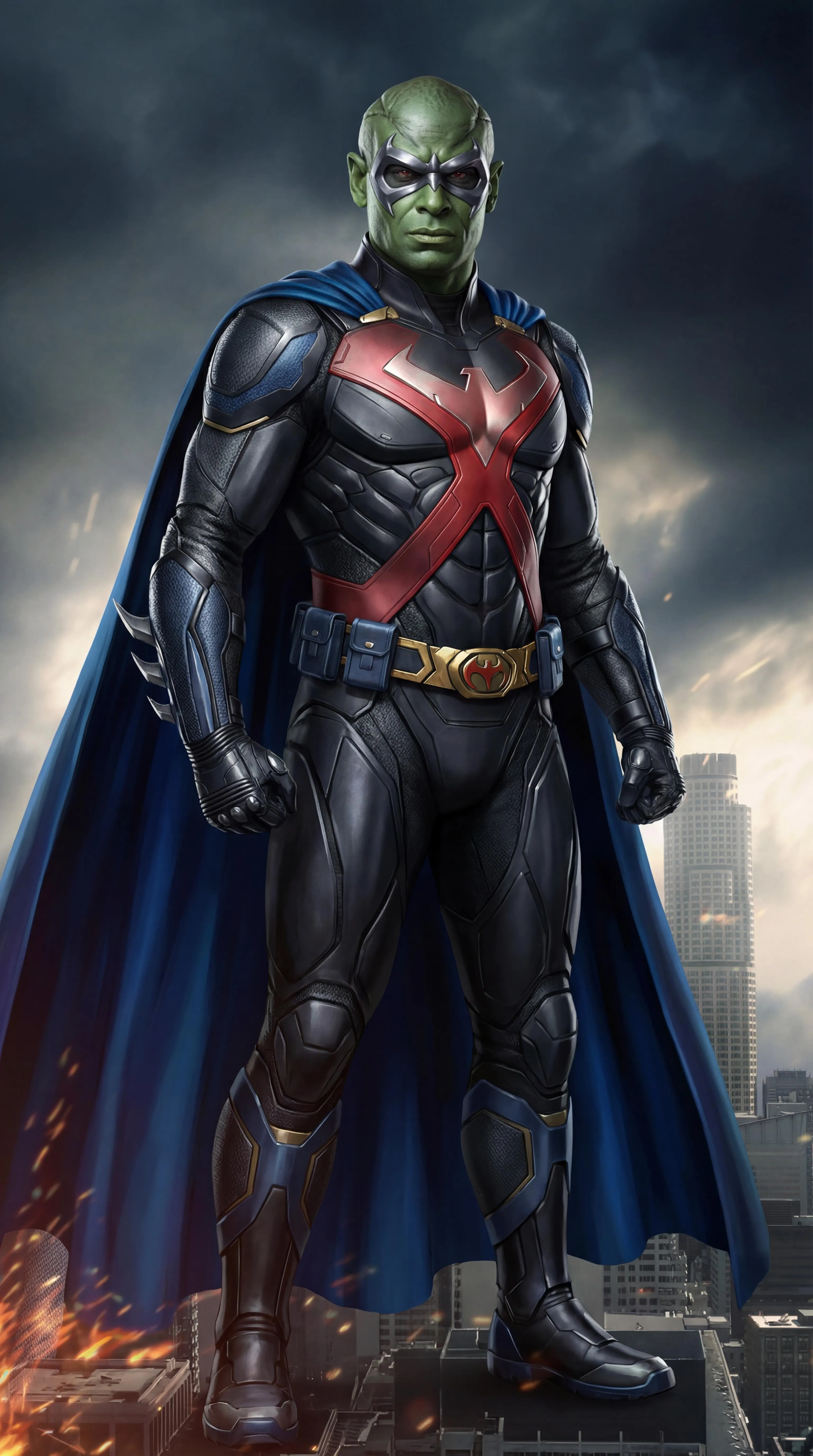 Create AI-generated art of Night Manhunter: A seamless fusion of Martian Manhunter and Nightwing. Features combined armor, the iconic red X chest logo, merged boots, utility belts, blue capes, and Nightwing's mask. Generate this unique superhero hybrid with vivago.ai's AI tools.