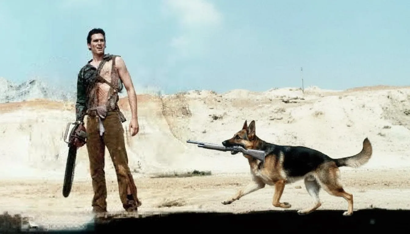 Transform Ash Williams' iconic scene with AI: Add a faithful dog returning his boomstick and seamlessly erase the gun from his left hand. Generate, replace, and edit images effortlessly with Vivago.ai's powerful generative AI and precision tools. Perfect Evil Dead fan edits.