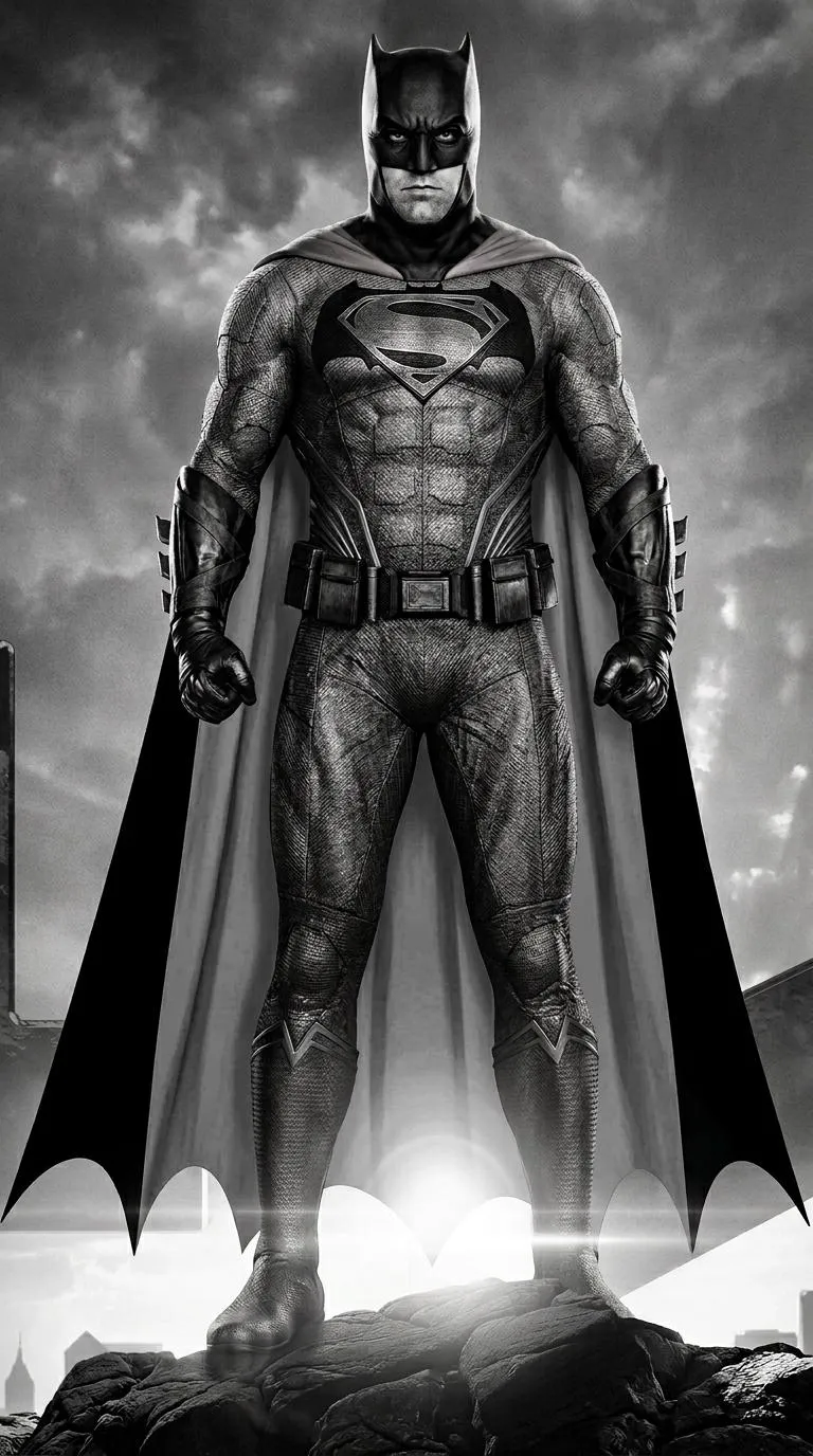 Create Henry Cavill Superman and Ben Affleck Batman fused as Superbat. AI art of their hybrid suit featuring Batman's mask, combined Bat/Superman chest logo, dual-color cape, and black & white style. Generate this unique superhero fusion with AI.