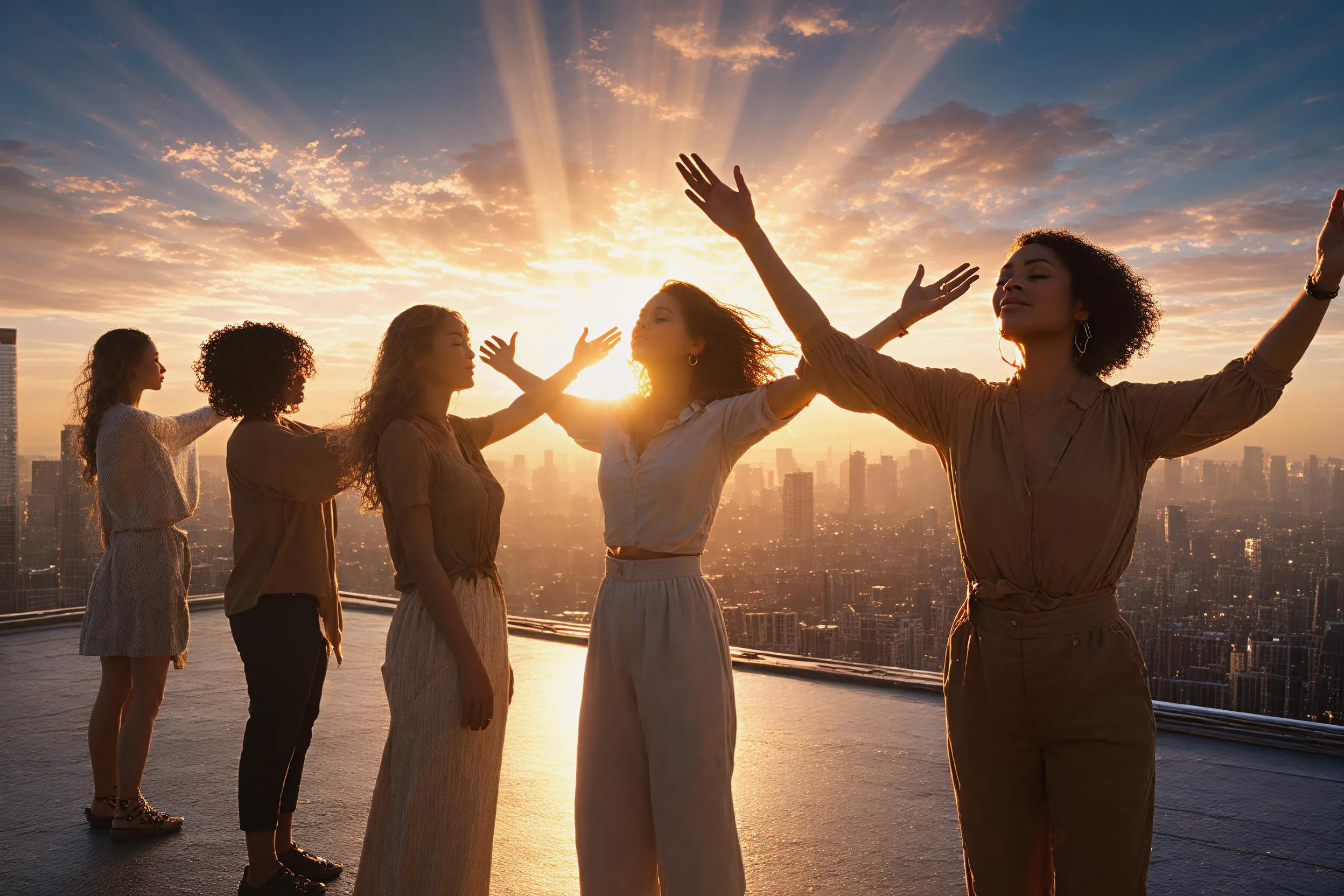Generate an ultra-realistic cinematic sunrise scene with Vivago.ai. Diverse women stand empowered on a high city rooftop, radiating confidence & gratitude. Golden sunlight beams illuminate their faces against a vibrant skyline. Capture triumphant hope & divine light in this AI image generator masterpiece. Keywords: AI image generator, cinematic sunrise, diverse women, empowered femininity, ultra-realistic, golden light, city skyline, triumphant hope, new beginnings, divine light.