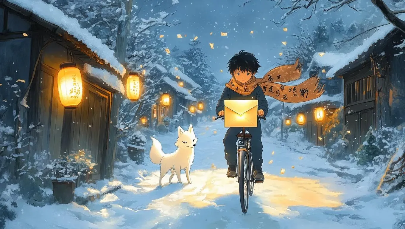 Create cinematic AI-generated anime art of a snowy village with a boy delivering glowing memory-letters. Rendered in soft Ghibli-style watercolor, featuring a white fox spirit, flickering lanterns, and enchanted melancholy. Pale gold highlights evoke dreamlike cyberpunk textures. Perfect for wistful, magical scenes.