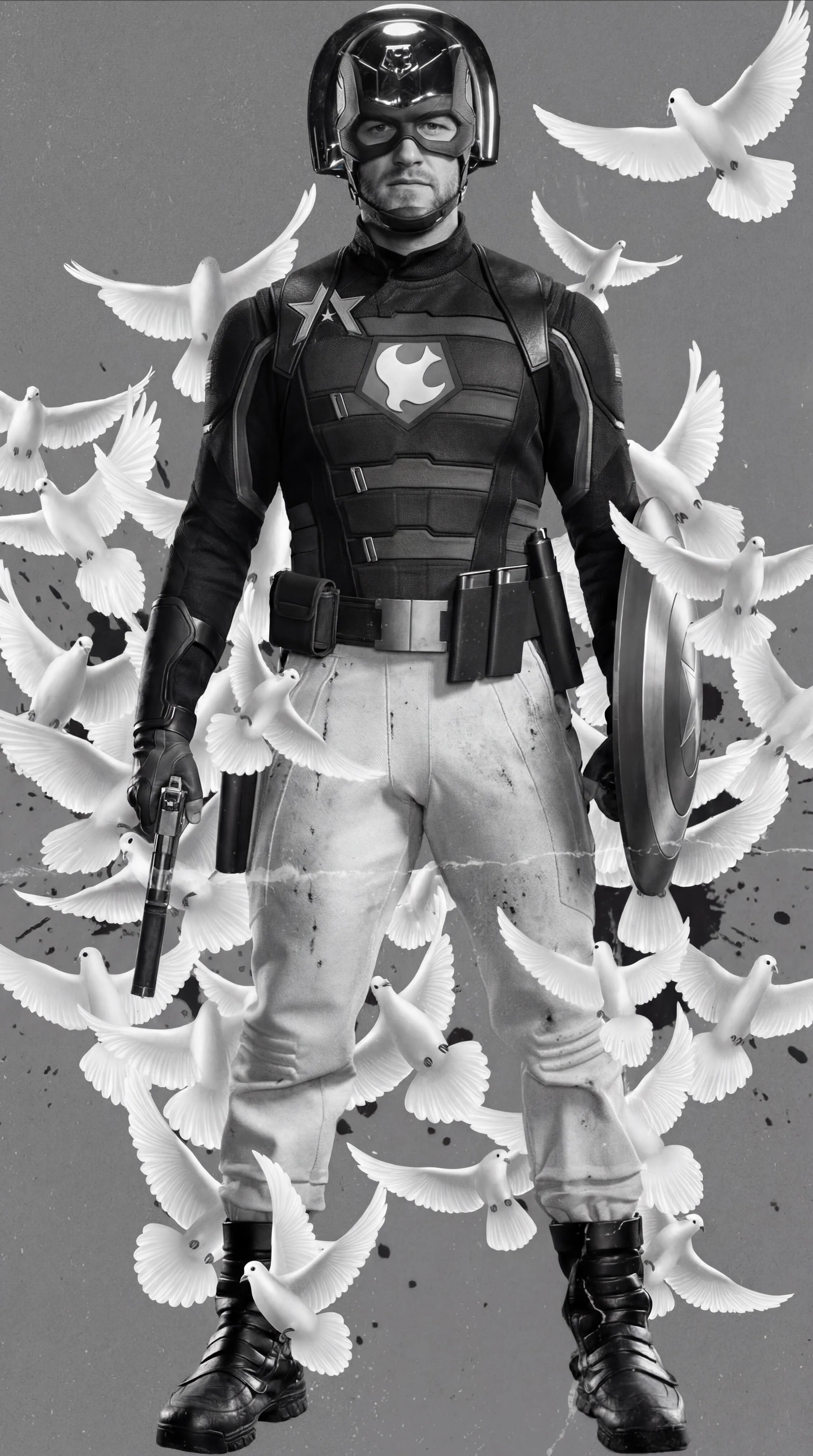 John Walker a.k.a. U.S. Agent (portrayed by Wyatt Russell) and Christopher Smith a.k.a. the Peacemaker (portrayed by John Cena) interchangeably combine into each other together as one to form Christopher Walker a.k.a. the U.S. Peacemaker. Their respective helmets are interchangeably combined as one. Their respective gloves are interchangeably combined as one. Their respective utility belts are interchangeably combined as one. U.S. Agent's long-sleeved blue shirt with red and white stripes is maintained while combining the star-shaped "A" logo on the right chest with the dove logo on the chest on the Peacemaker's shirt as one. The Peacemaker's white khakis are maintained while replacing his blue boots with U.S. Agent's black boots.