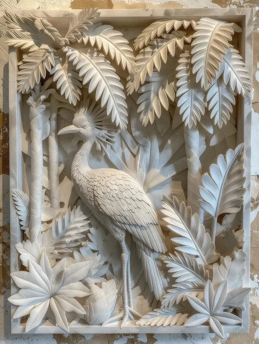 Generate a stunning Balinese-style 3D bas relief panel in white sandstone. Features hand-carved Licuala fan palms and a cassowary amid lush forest, masterfully crafted for opulent boutique hotel décor. Leverage AI artistry and the golden ratio for this exquisite, custom luxury design element.