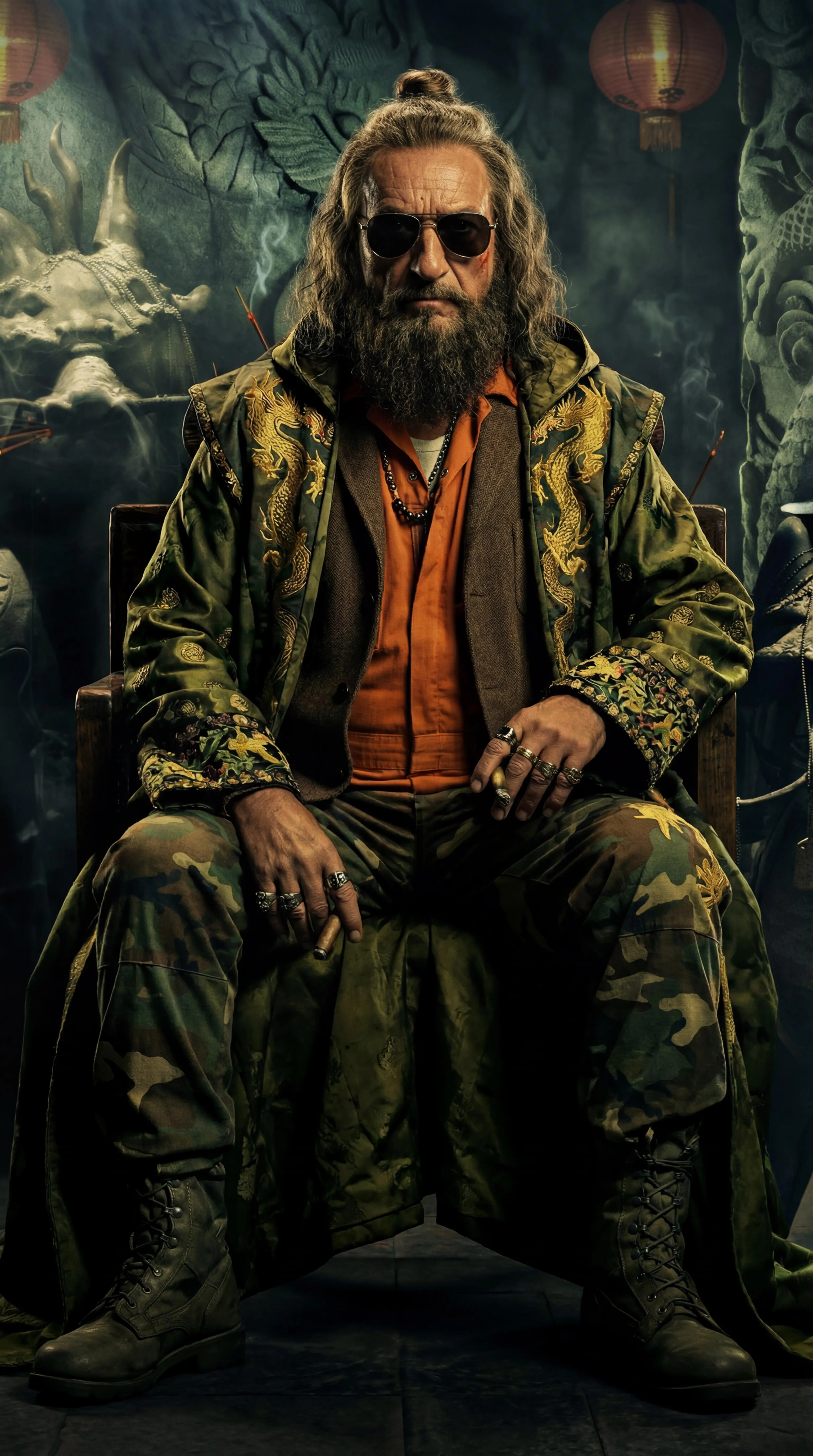 Create AI art of Trevor Slattery (Ben Kingsley) fused from four Marvel appearances: hair, sunglasses, ten rings, and his menacing warlord outfit. Features layered costumes: orange jumpsuit under ornate dragon robe and brown sport coat. Generate this unique composite character with vivago.ai's AI image tools.