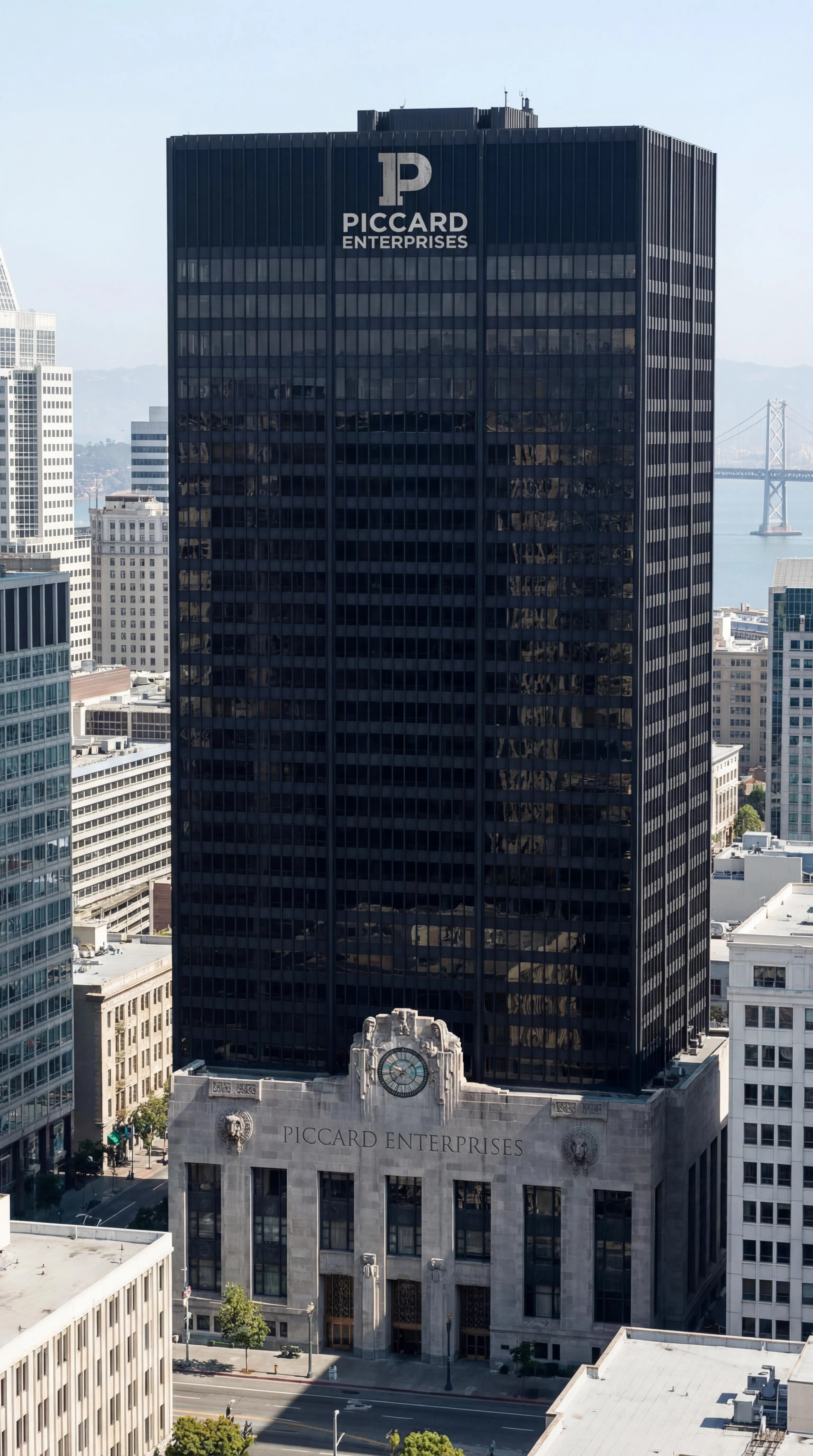 Generate an AI image of Wayne Tower from The Dark Knight Trilogy reimagined in Oakland, California, featuring Piccard Enterprises branding. Replace the iconic Wayne logo with custom Piccard signage using vivago.ai's advanced AI tools for professional visual content creation and editing.