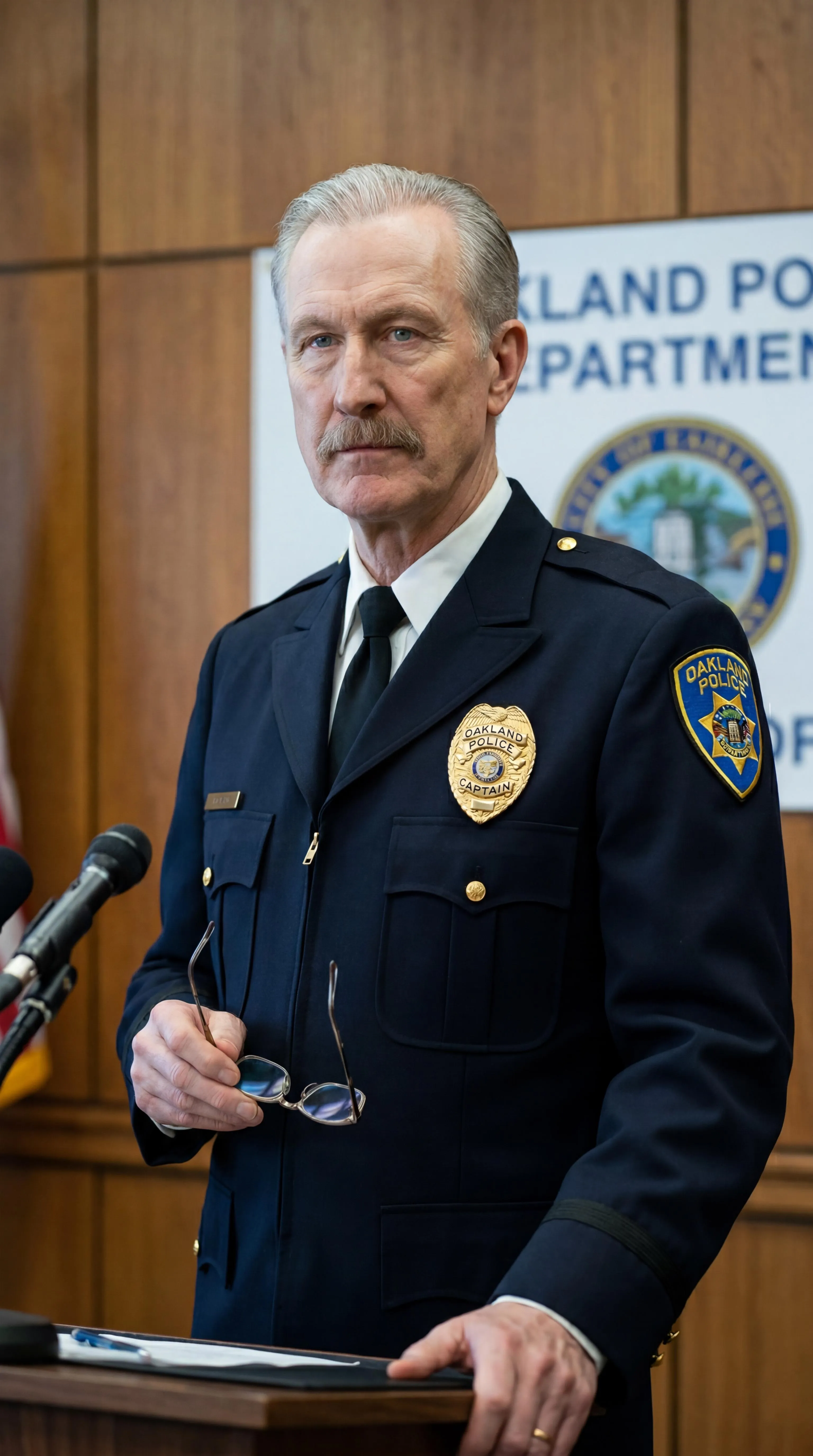 New York Police Department captain George Stacy (portrayed by James Cromwell) and Gotham Police Department Commissioner Jim Gordon (portrayed by Gary Goldman) interchangeably combine together into each other as one, facial and physical features alike. The NYPD badge on Stacy's uniform and the GCPD badge on Gordon's uniform are both replaced with the Oakland Police Department badge. No sensitive information or guidelines violating content seen or involved.