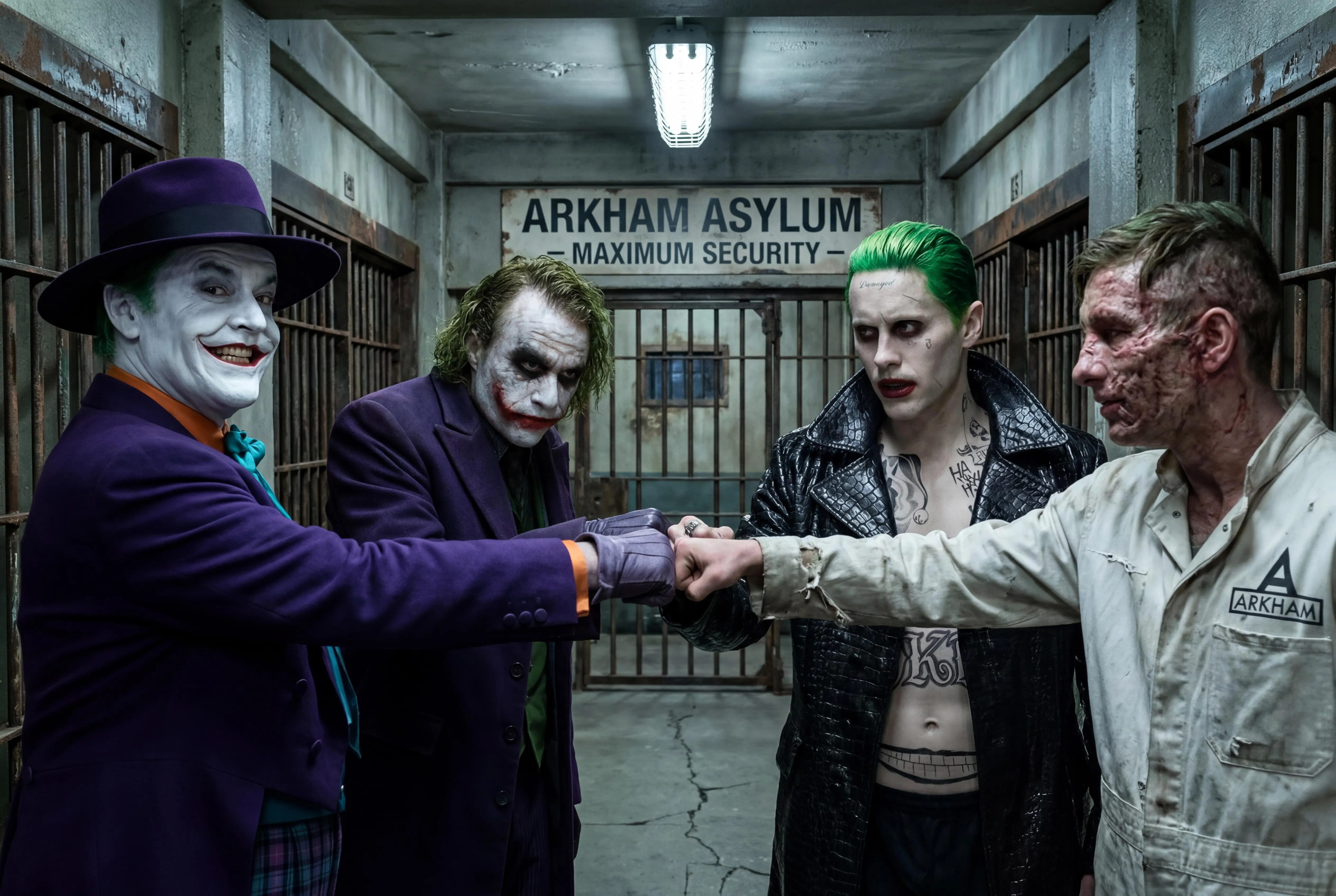 The Joker (portrayed by Jack Nicholson, Heath Ledger, Jared Leto, and Barry Keoghan) share a knuckle bump together in Arkham Asylum.