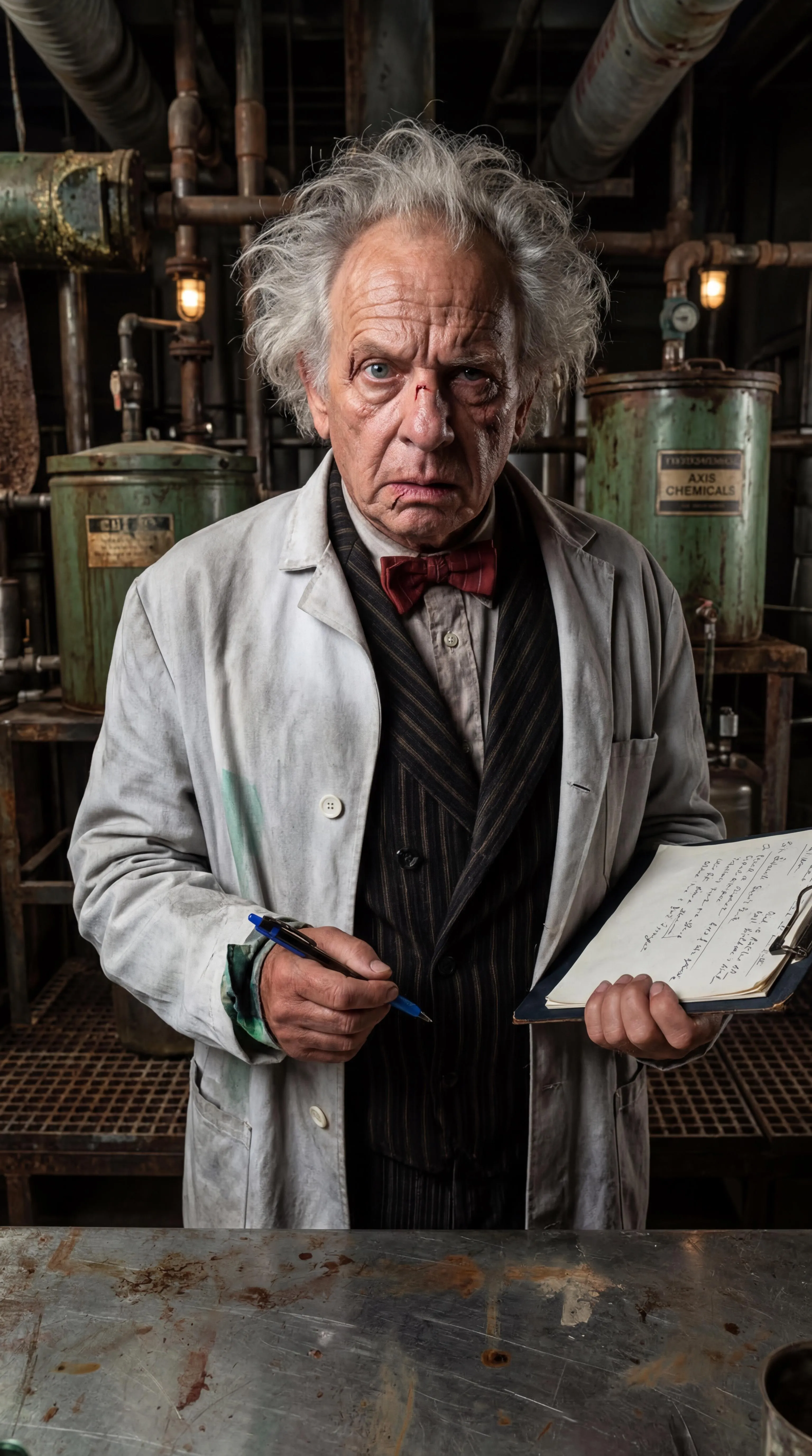 All four of these images of the scientist at Axis Chemicals from Tim Burton's Batman from 1989 (retroactively confirmed to be Hugo Strange) interchangeably combine together into each other as one to create complete visualizations of Hugo Strange to match what he could've looked like in sequels. No Axis Chemicals logos or files on Batman or Bruce Wayne seen. No sensitive information or guidelines violating content seen or involved.