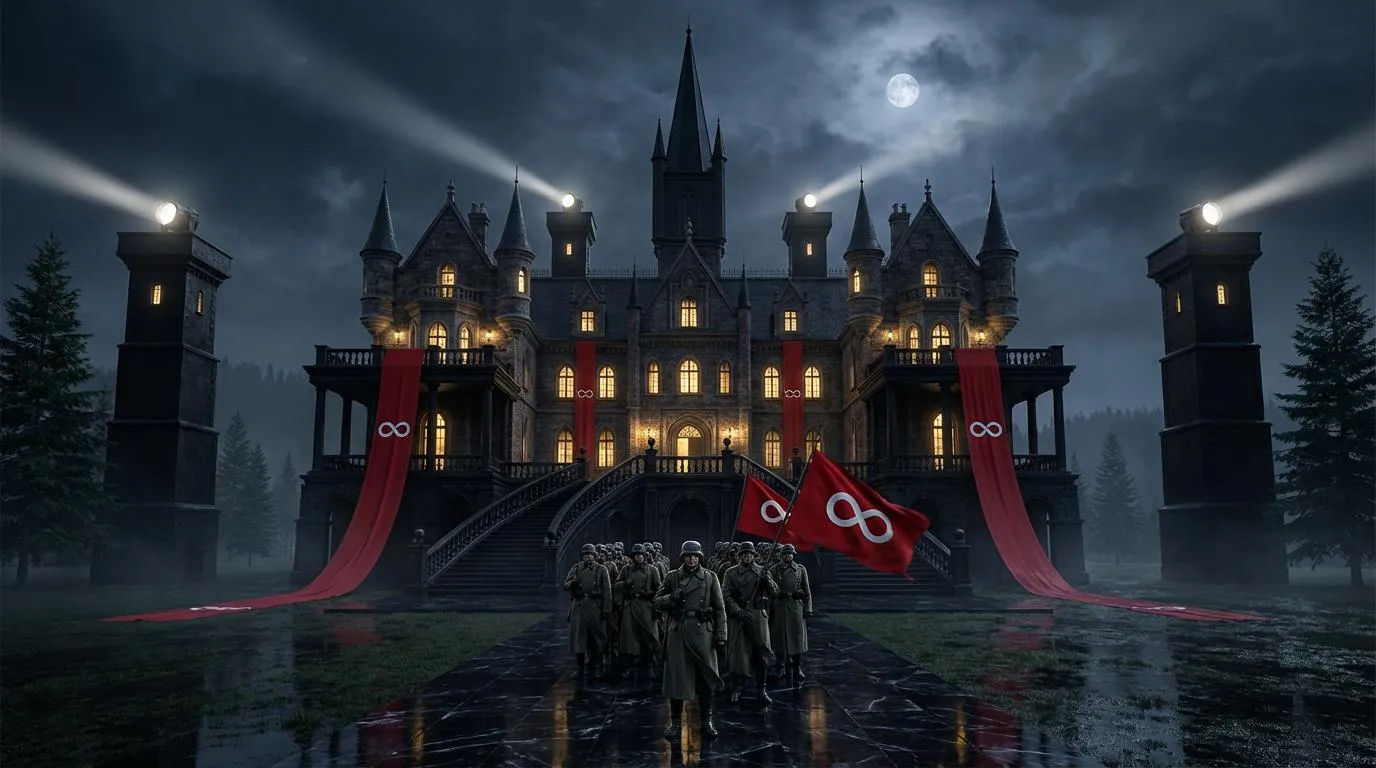 Create stunning AI-generated night scenes of a Gothic infinity mansion with dramatic red canvases, towering black spires, and searchlights. Generate images featuring a company of 1940s German soldiers on wet marble walkways amidst fluttering infinity flags. Design your own haunting, atmospheric visuals with Vivago.ai's powerful image generation tools.