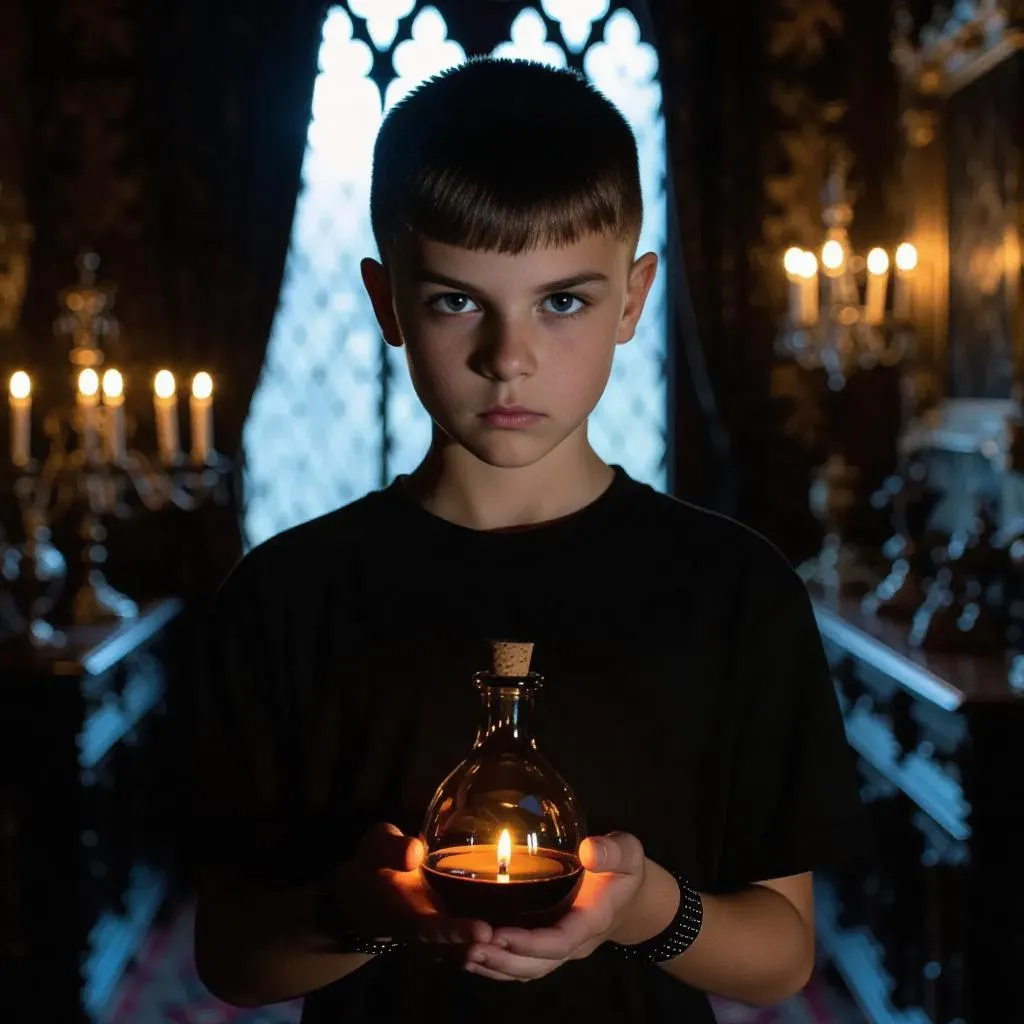Craft an ultra-high clarity AI image of a streetwise eleven-year-old boy with bob-cut hair, broad forehead, green eyeballs, and a high nose bridge. He wears a fitted black t-shirt and jeans, clutching an eerie potion bottle in a dim, Gothic room with antique lights and long, artful shadows. Create a determined, menacing character portrait with vivago.ai.