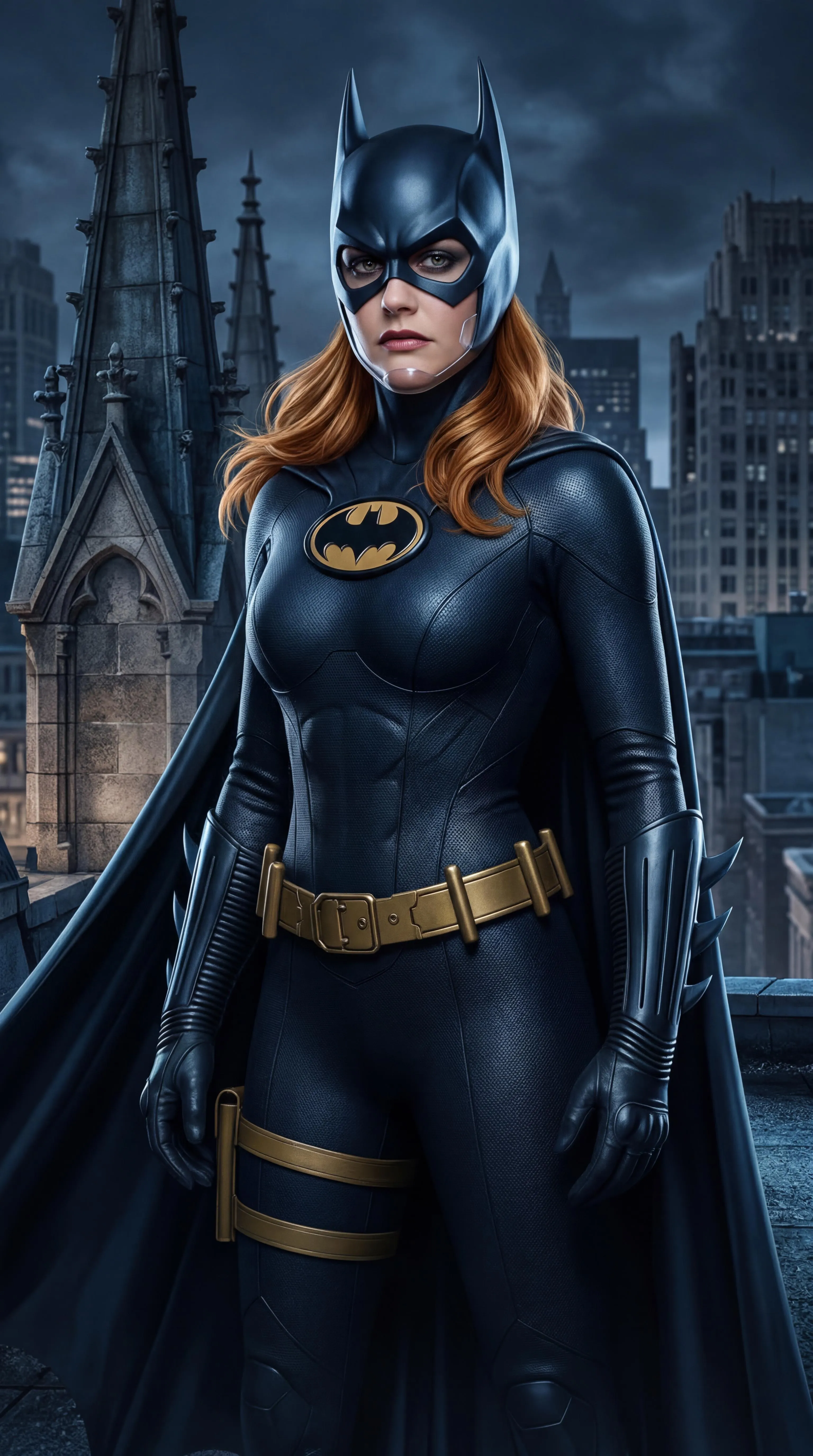 Batgirl's suit from Batman & Robin is translated into the visual style of Batgirl's suit from the comic Batman '89 while retaining the realistic visual aesthetic. Her hair is therefore reddish blond (or blondish red). No artist signature is seen. No sensitive information or guidelines violating content seen or involved.