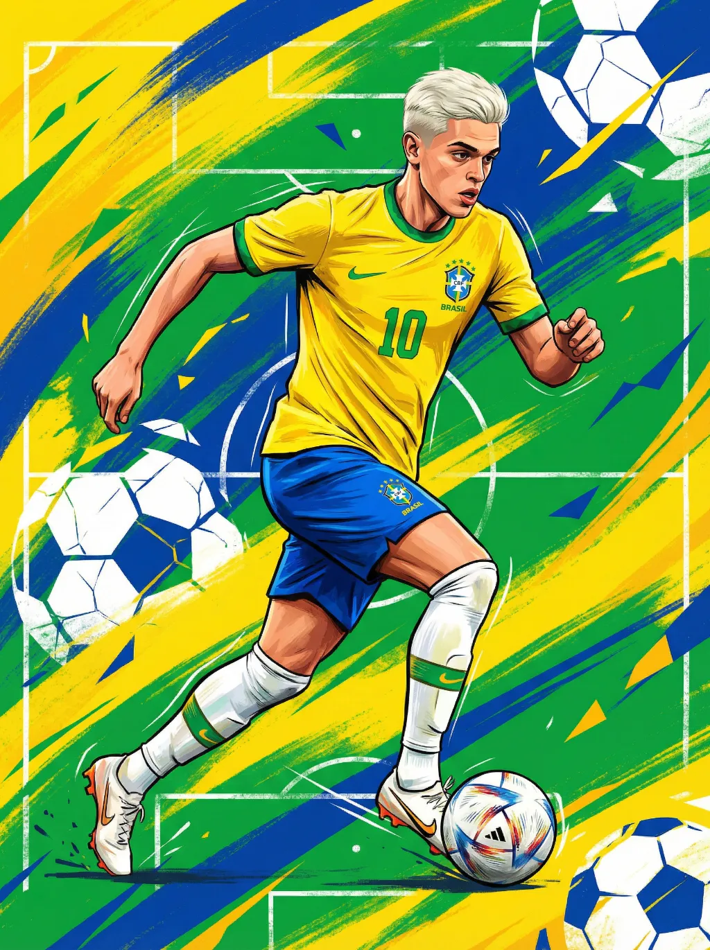 Dynamic digital illustration of a Brazilian soccer player in action, dribbling a soccer ball mid-motion. Outfit: bright yellow Brazil national team jersey with green trim and number 10, blue shorts, white knee-high socks with green and gold accents, white soccer cleats with orange details. Hair: short platinum blonde hair, styled neatly. Background: abstract energetic composition with sweeping brushstrokes in Brazil's national colors (yellow, green, blue), fragmented geometric shapes resembling cracked soccer balls, faint white soccer field markings, and dynamic angular accents. Style: bold graphic illustration, high contrast, vibrant saturated colors, fluid motion lines, energetic and celebratory mood, clean vector-like lines with textured brushwork, no text or watermarks.